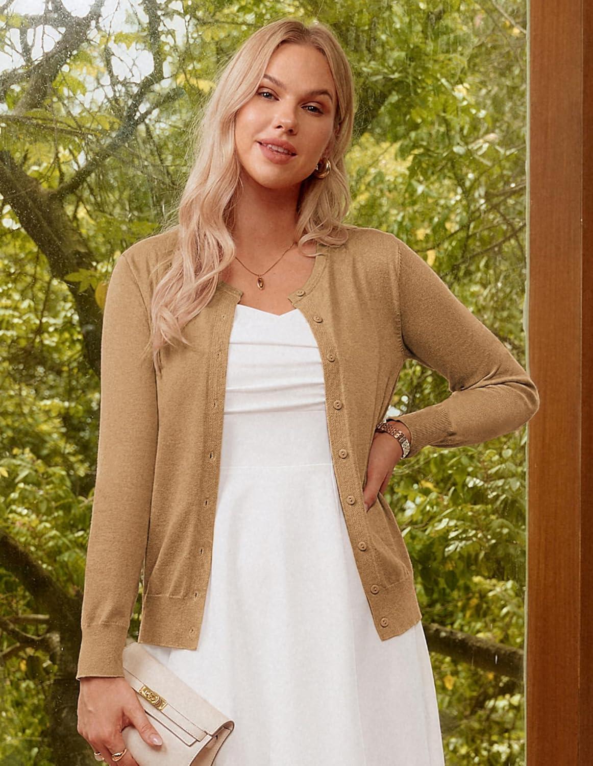 GRACE KARIN Women’s Long Sleeve Button Down Crew Neck Classic Sweater Knit Cardigan(Golden Apricot)