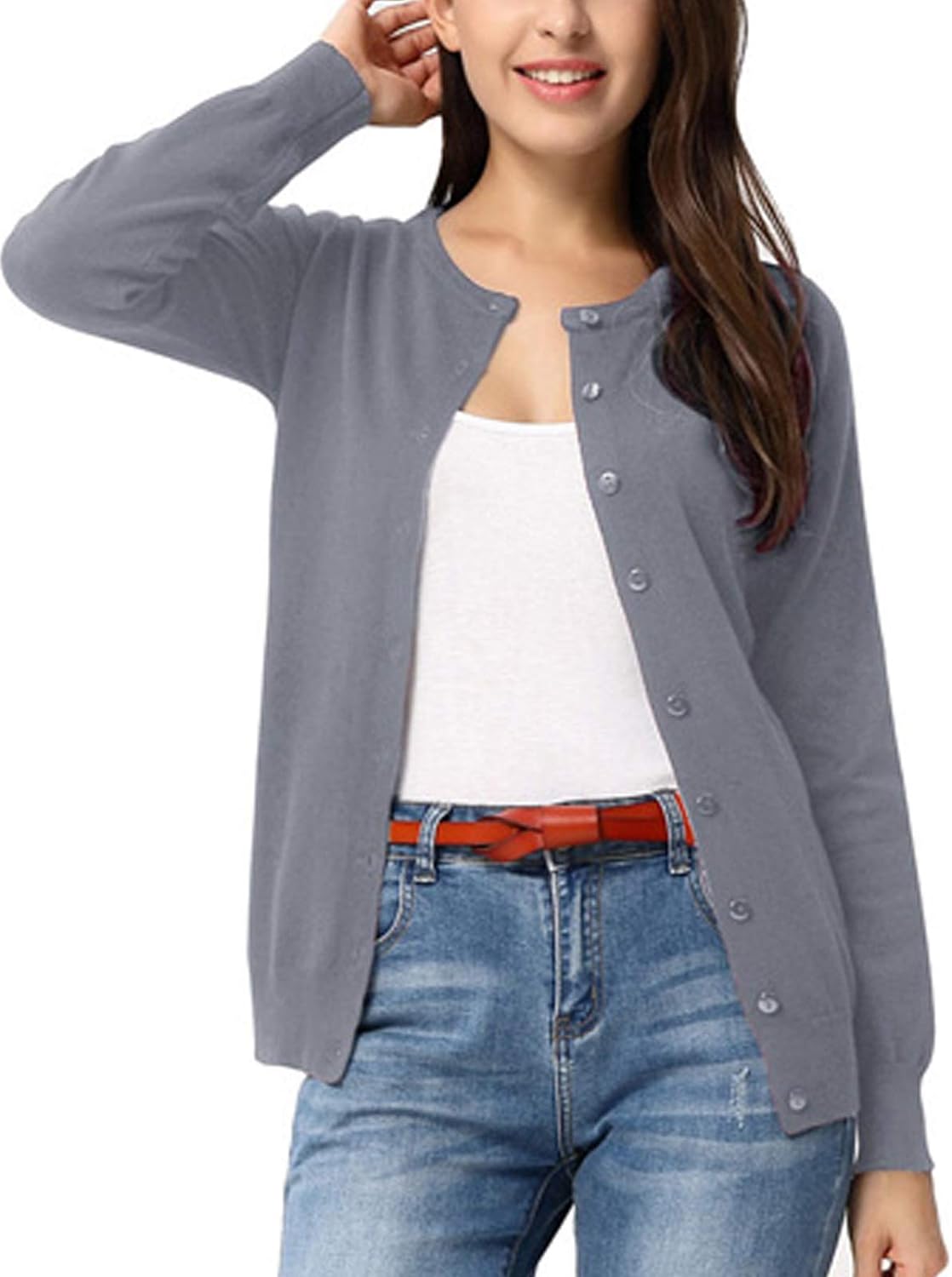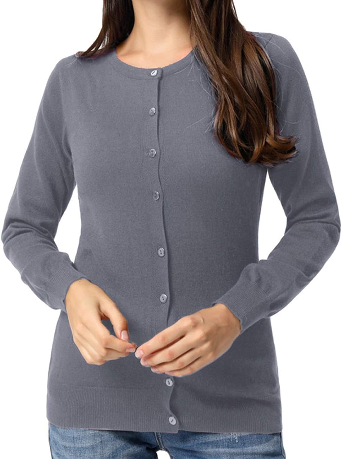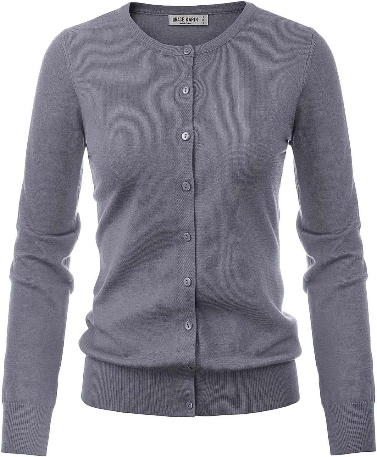 GRACE KARIN Womens Long Sleeve Button Down Crew Neck Classic Sweater Knit CardiganGrey Blue