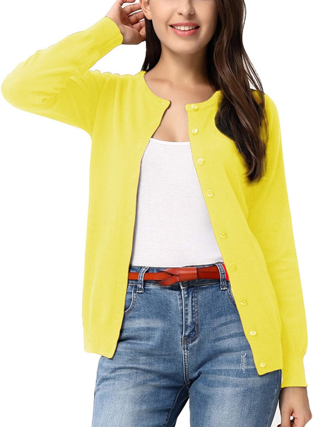 GRACE KARIN Women’s Long Sleeve Button Down Crew Neck Classic Sweater Knit Cardigan(Lemon Yellow)