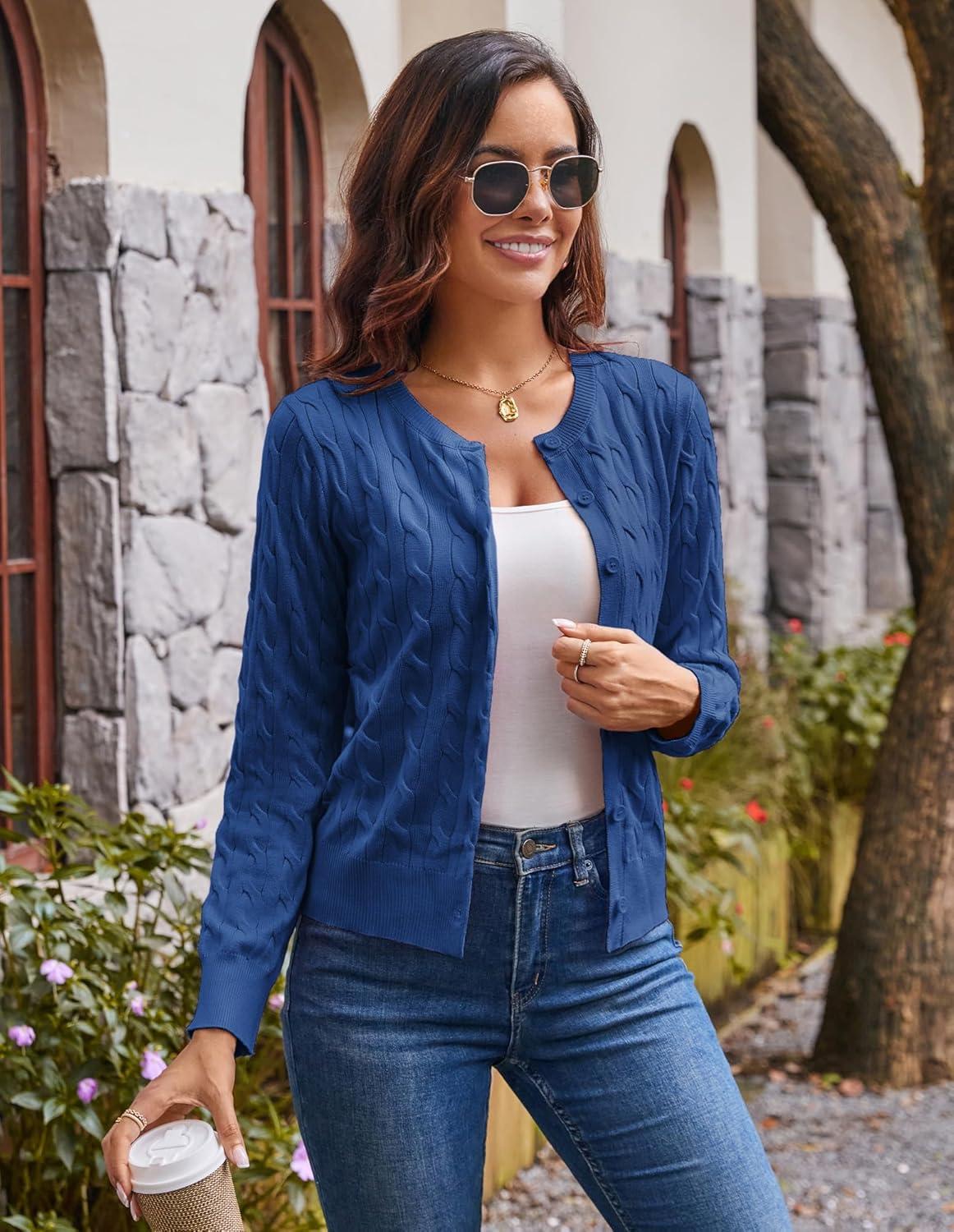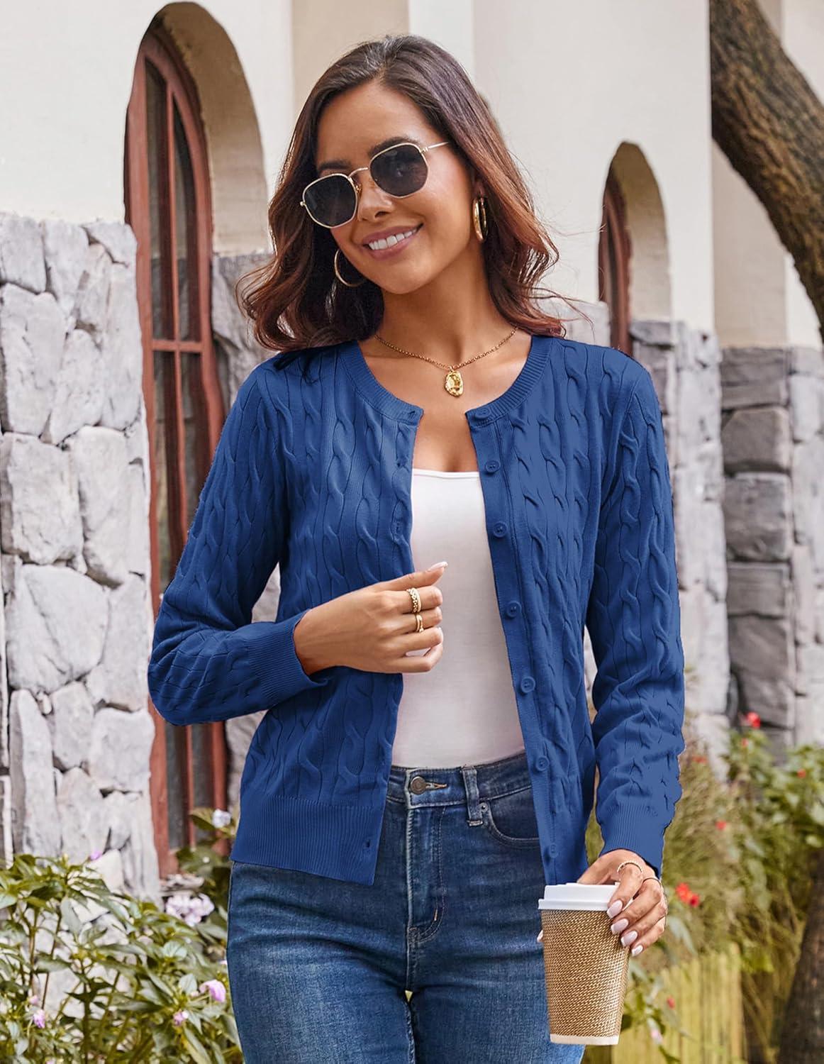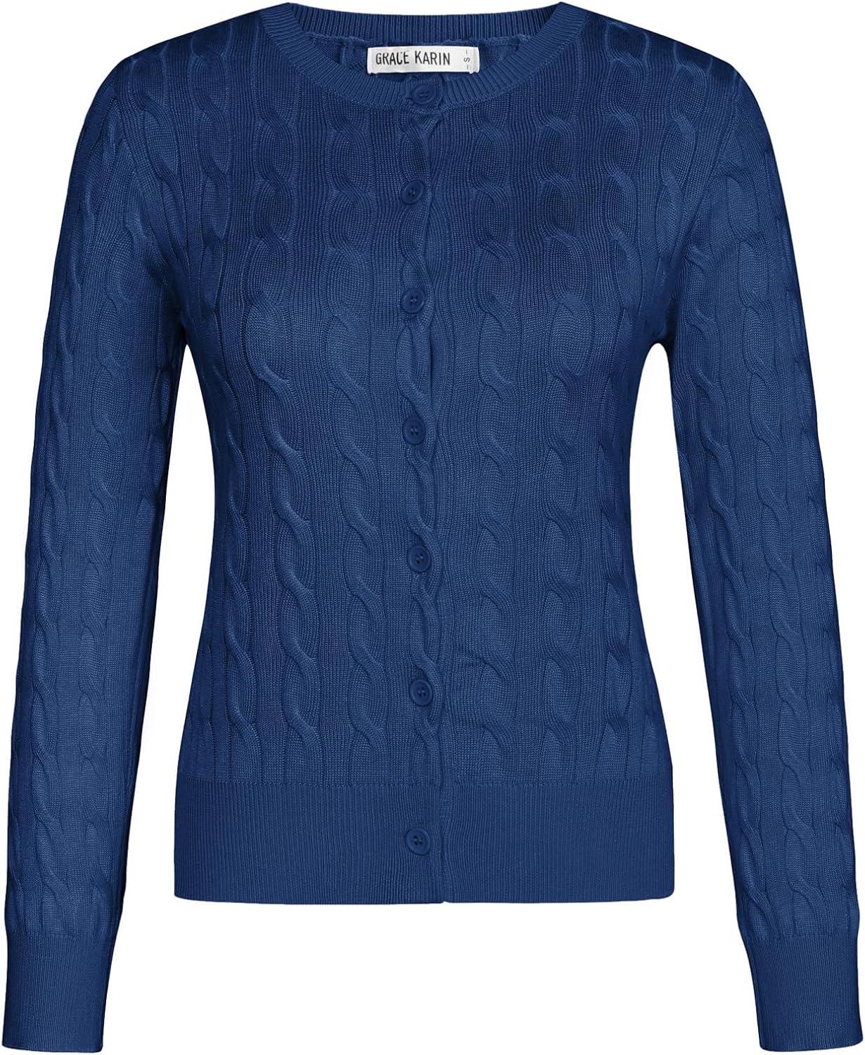 GRACE KARIN Womens Long Sleeve Button Up Cable Knit Cardigan Lightweight 2025 Crewneck Button Down Sweaters for Women(Denim Blue)