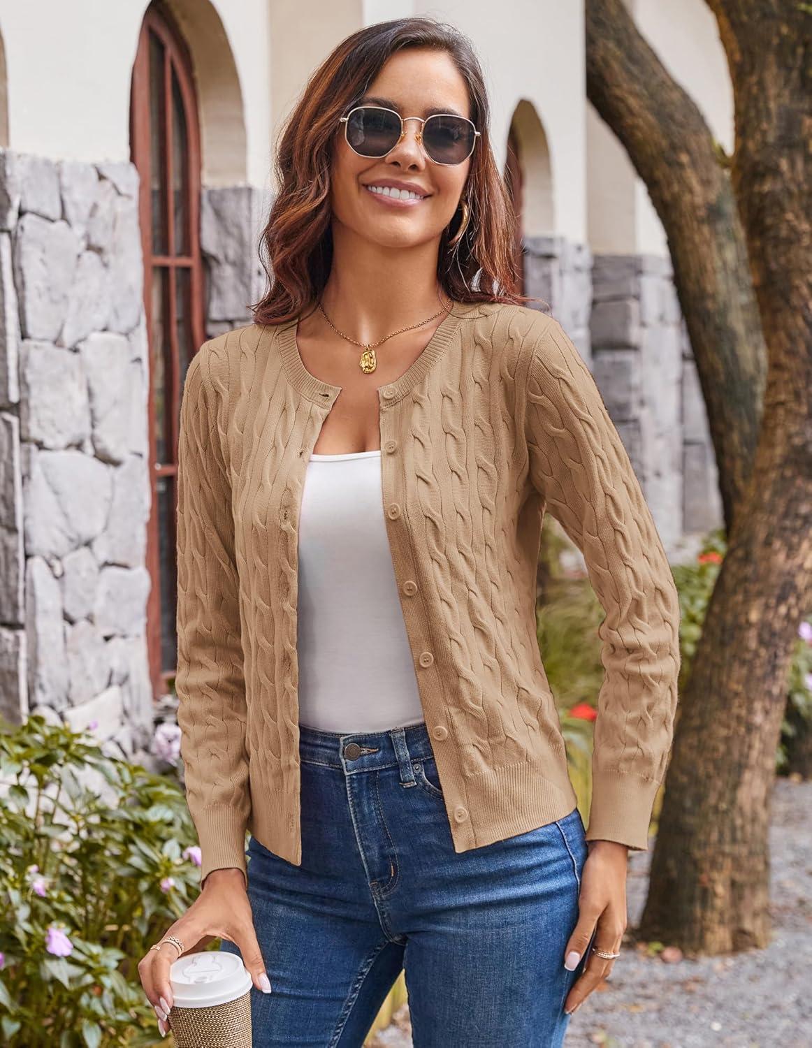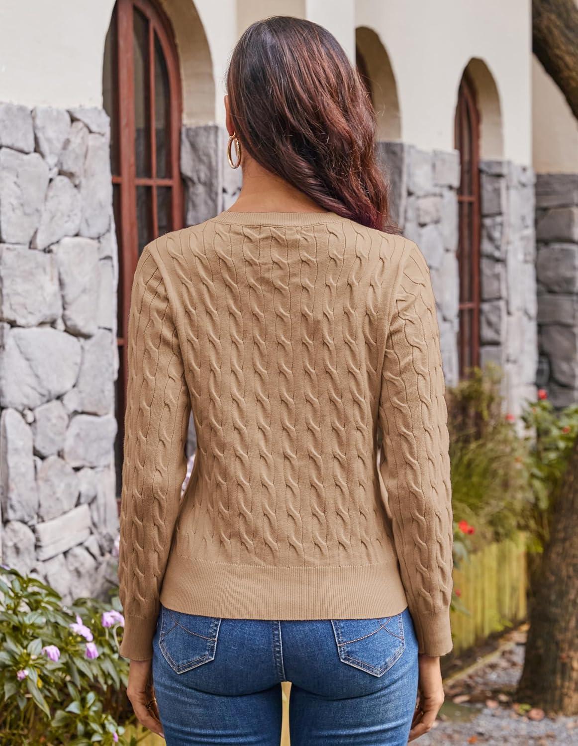 GRACE KARIN Women's Long Sleeve Button Up Cable Knit Cardigan Lightweight 2025 Crewneck Button Down Sweaters for Women(Light Khaki)