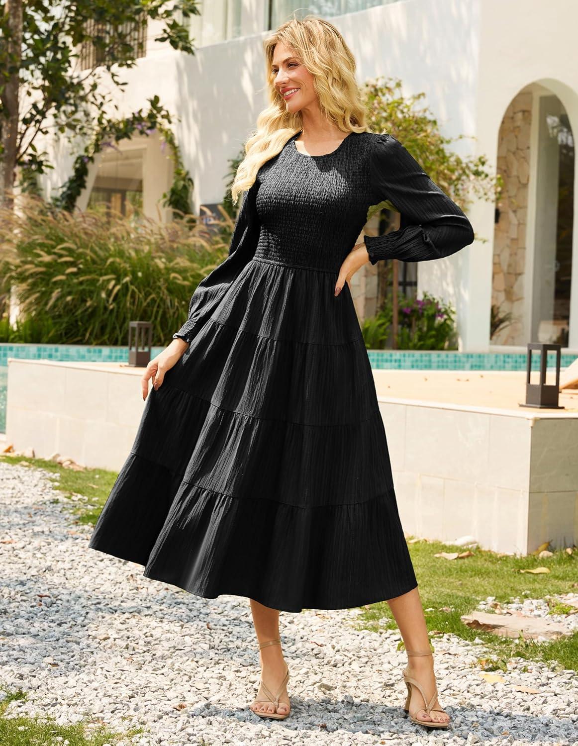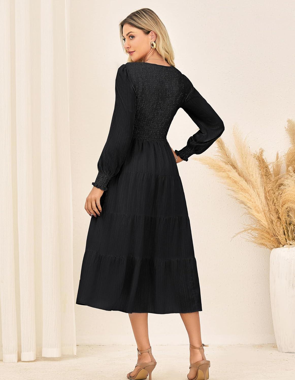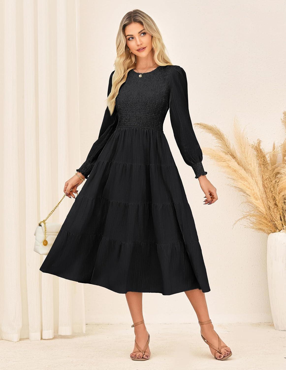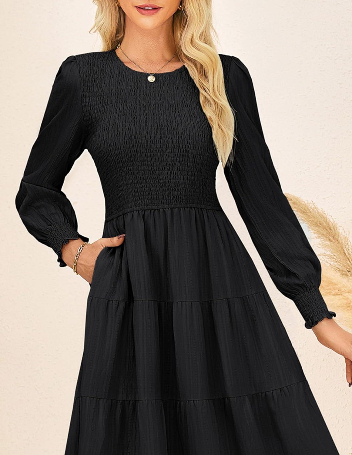 GRACE KARIN Women’s Long Sleeve Dress 2025 Fall Smocked Tiered A Line Casual Work Midi Flowy Church Dresses Pockets(Black)