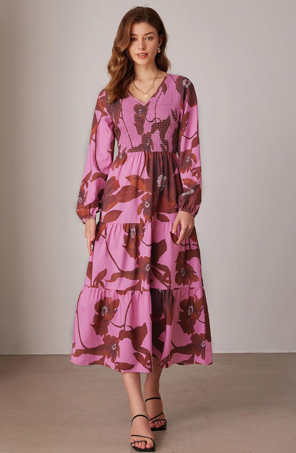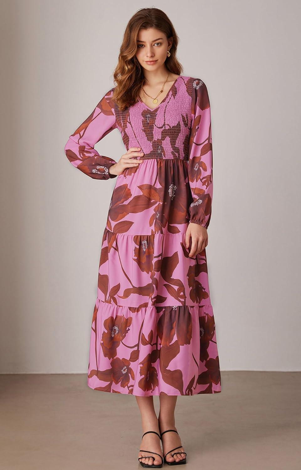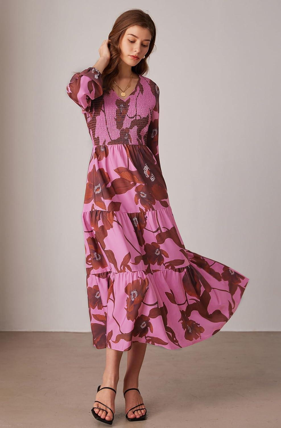 GRACE KARIN Women's Long Sleeve Dress Fall V Neck Smocked Tiered A-Line Dresses Formal Cocktail Wedding Guest Maxi Dress(Pink Brown)