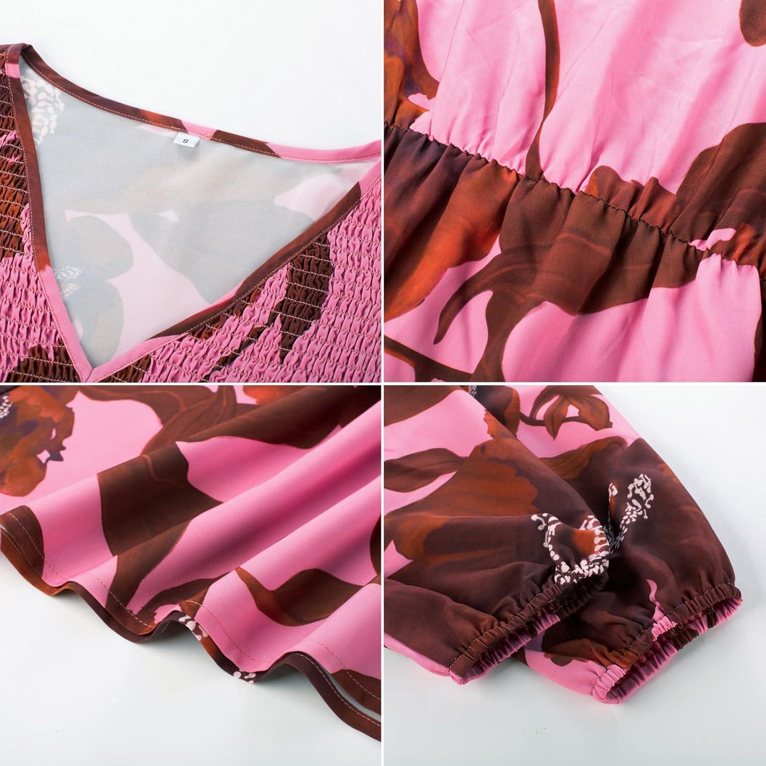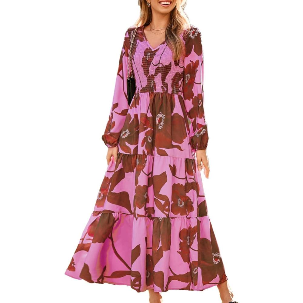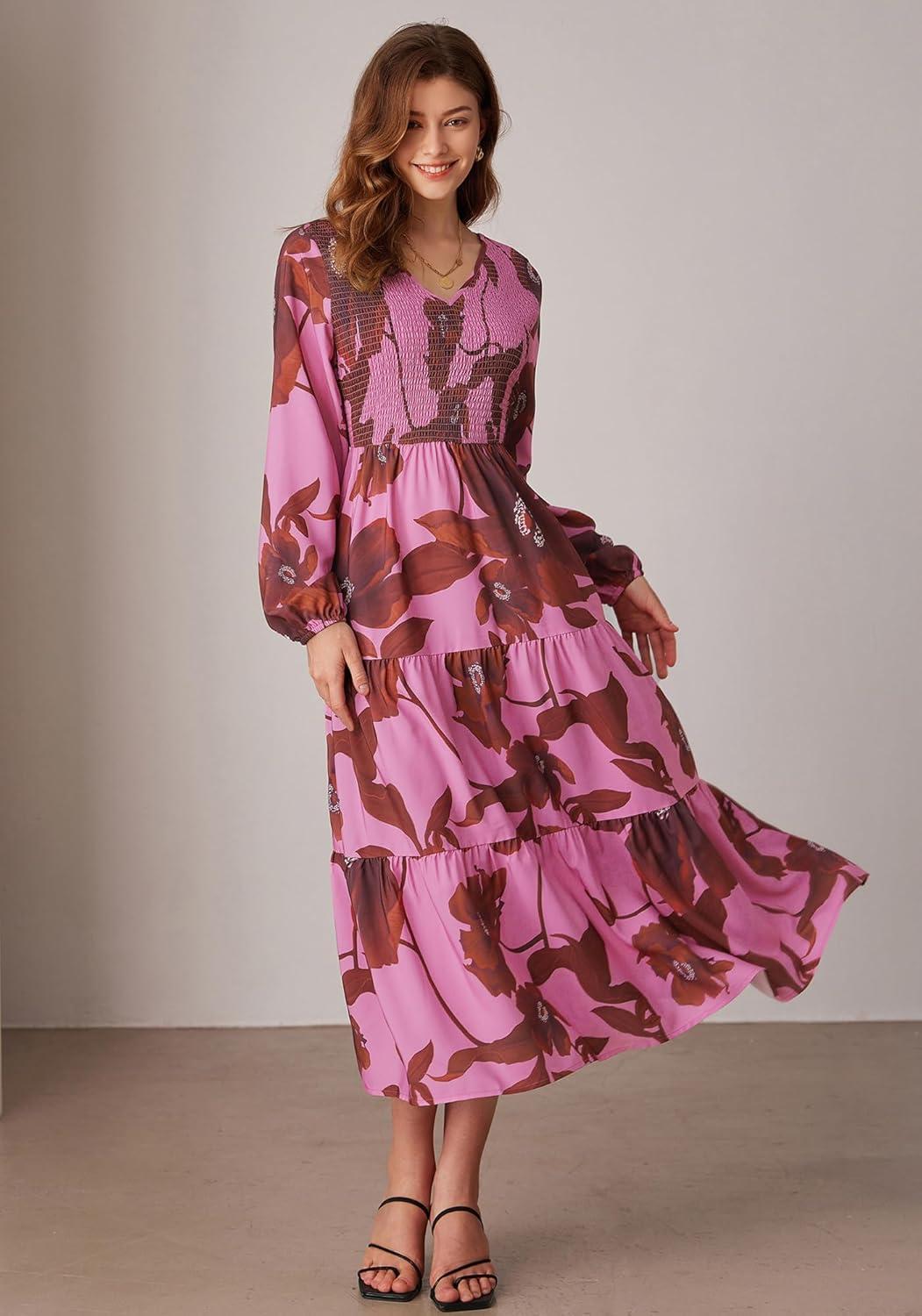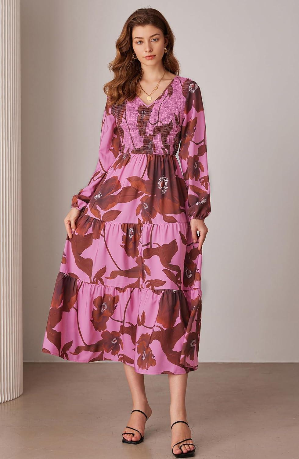 GRACE KARIN Women's Long Sleeve Dress Fall V Neck Smocked Tiered A-Line Dresses Formal Cocktail Wedding Guest Maxi Dress(Pink Brown)