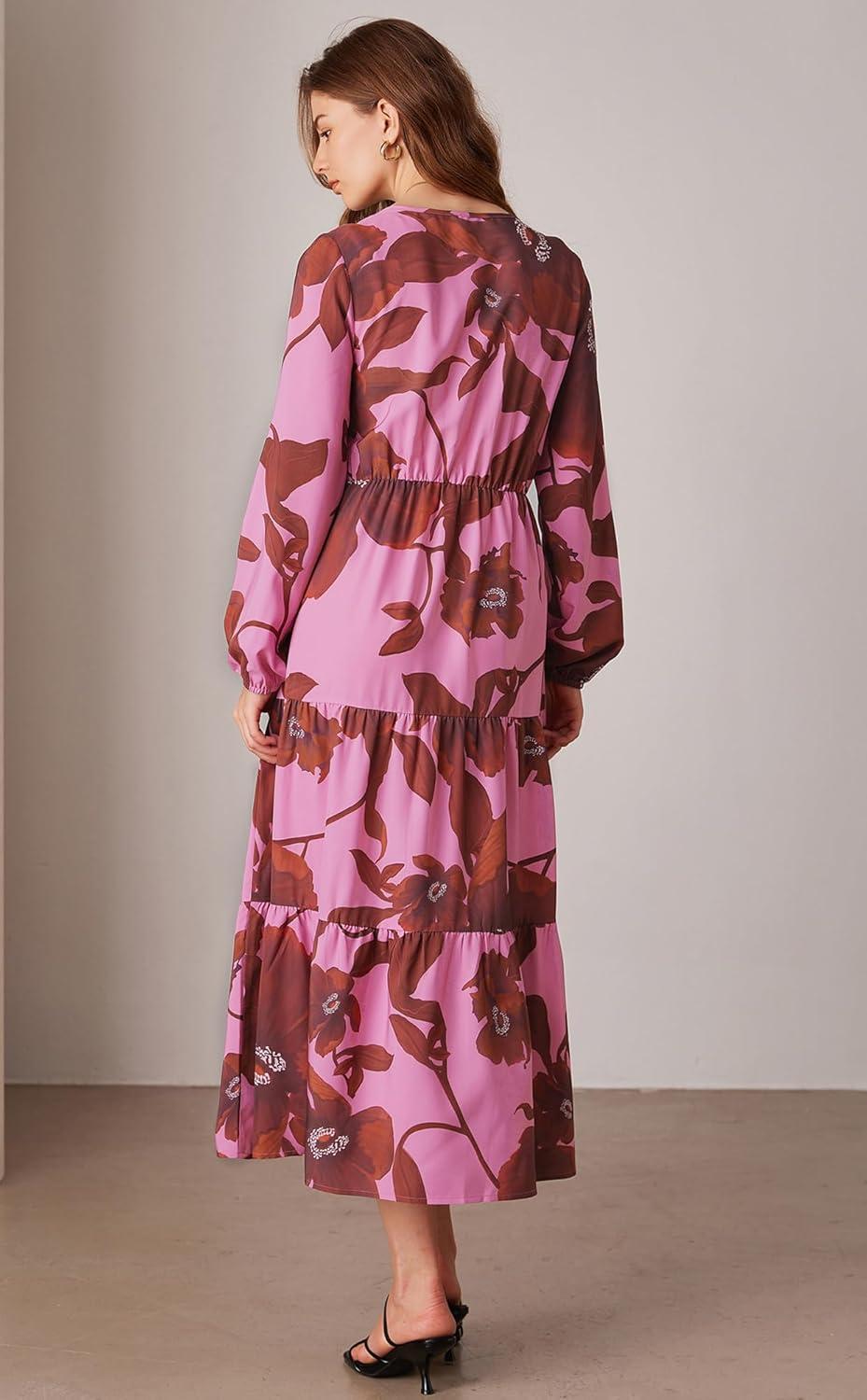 GRACE KARIN Women’s Long Sleeve Dress Fall V Neck Smocked Tiered A-Line Dresses Formal Cocktail Wedding Guest Maxi Dress(Pink Brown)