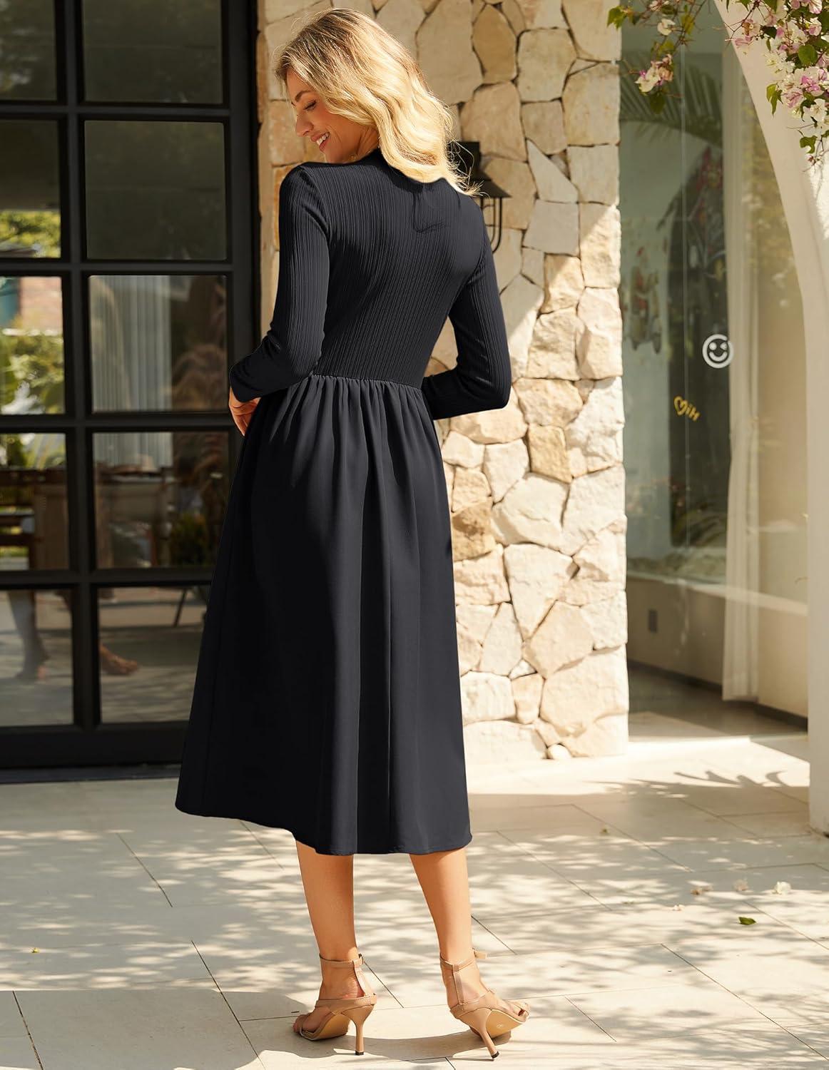 GRACE KARIN Women's Long Sleeve Fall Dress 2025 Mock Neck Midi Patchwork Dress Casual Wedding Guest Flowy Dresses Pockets(Black)