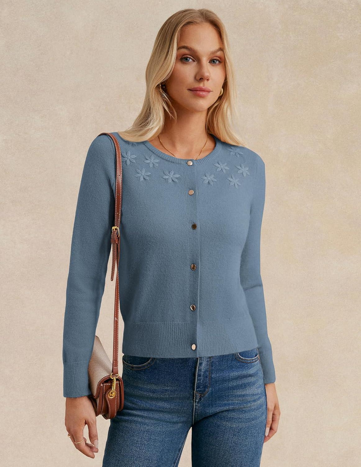 GRACE KARIN Women's Long Sleeve Knitted Cardigan Sweaters Crew Neck Button Up Fuzzy Flower Sweaters Fall Outfits(Gray Blue)