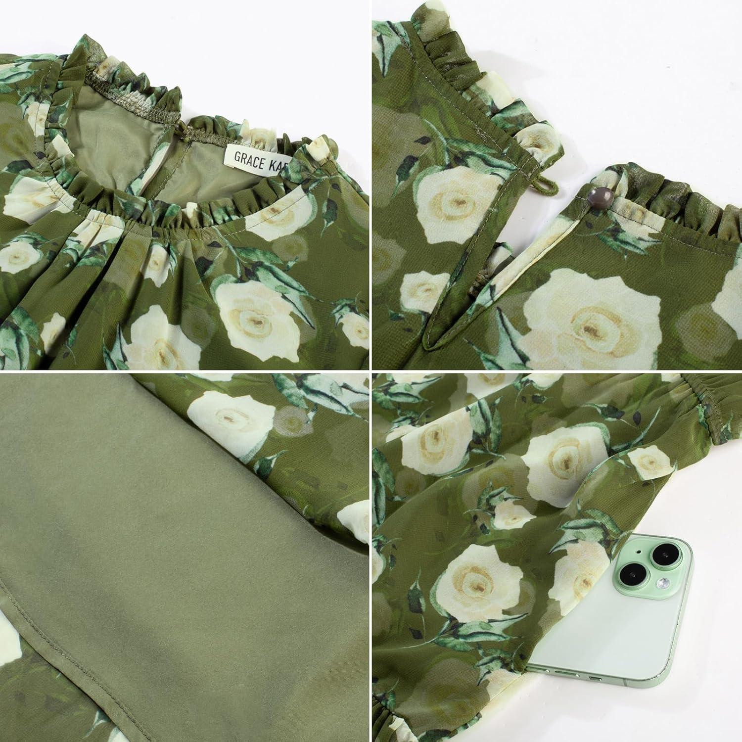 GRACE KARIN Women’s Long Sleeve Maxi Dress Fall 2025 Chiffon Flowy Wedding Guest Dresses Floral Tiered Dress with Pockets(Green and White Floral)