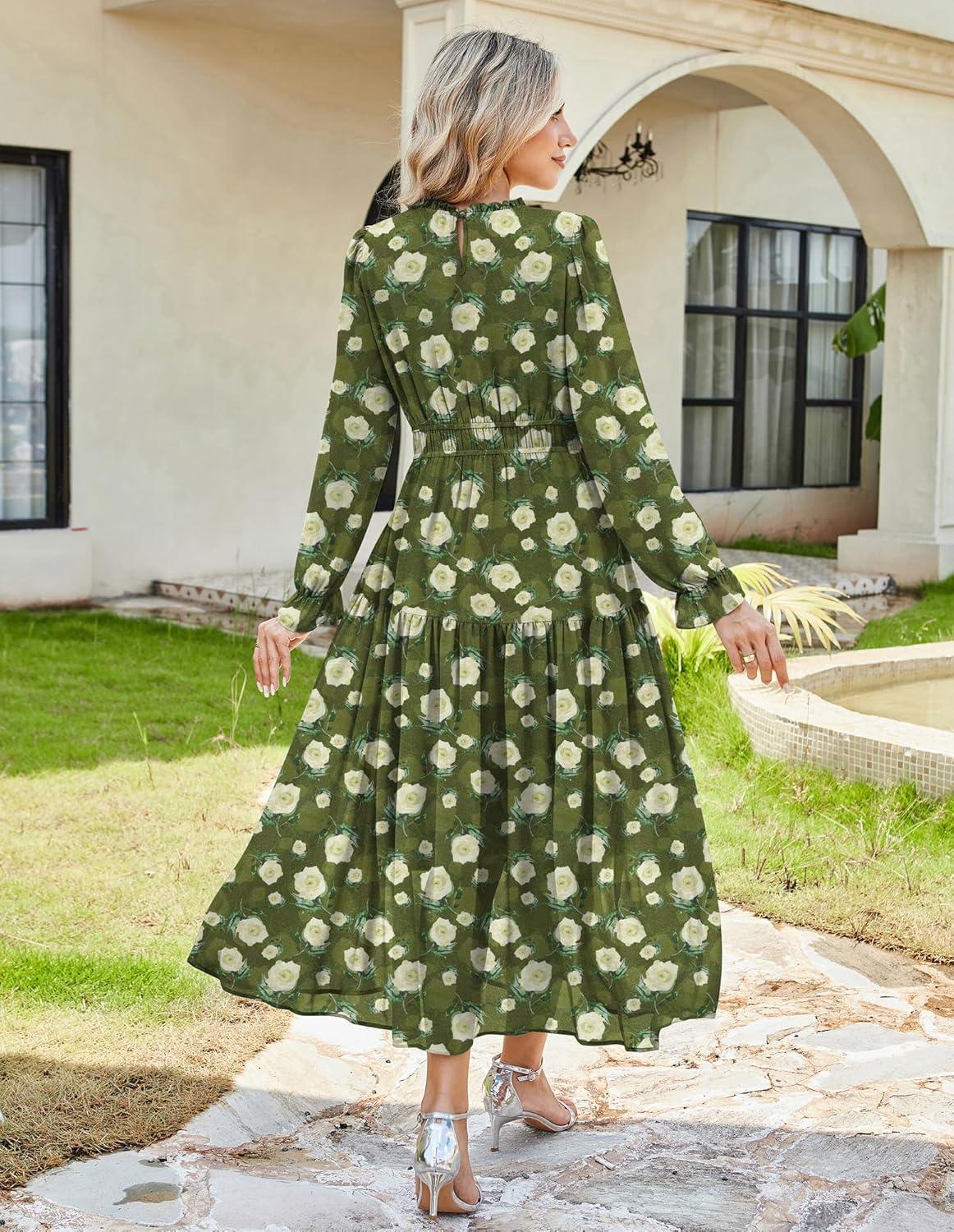 GRACE KARIN Women's Long Sleeve Maxi Dress Fall 2025 Chiffon Flowy Wedding Guest Dresses Floral Tiered Dress with Pockets(Green and White Floral)