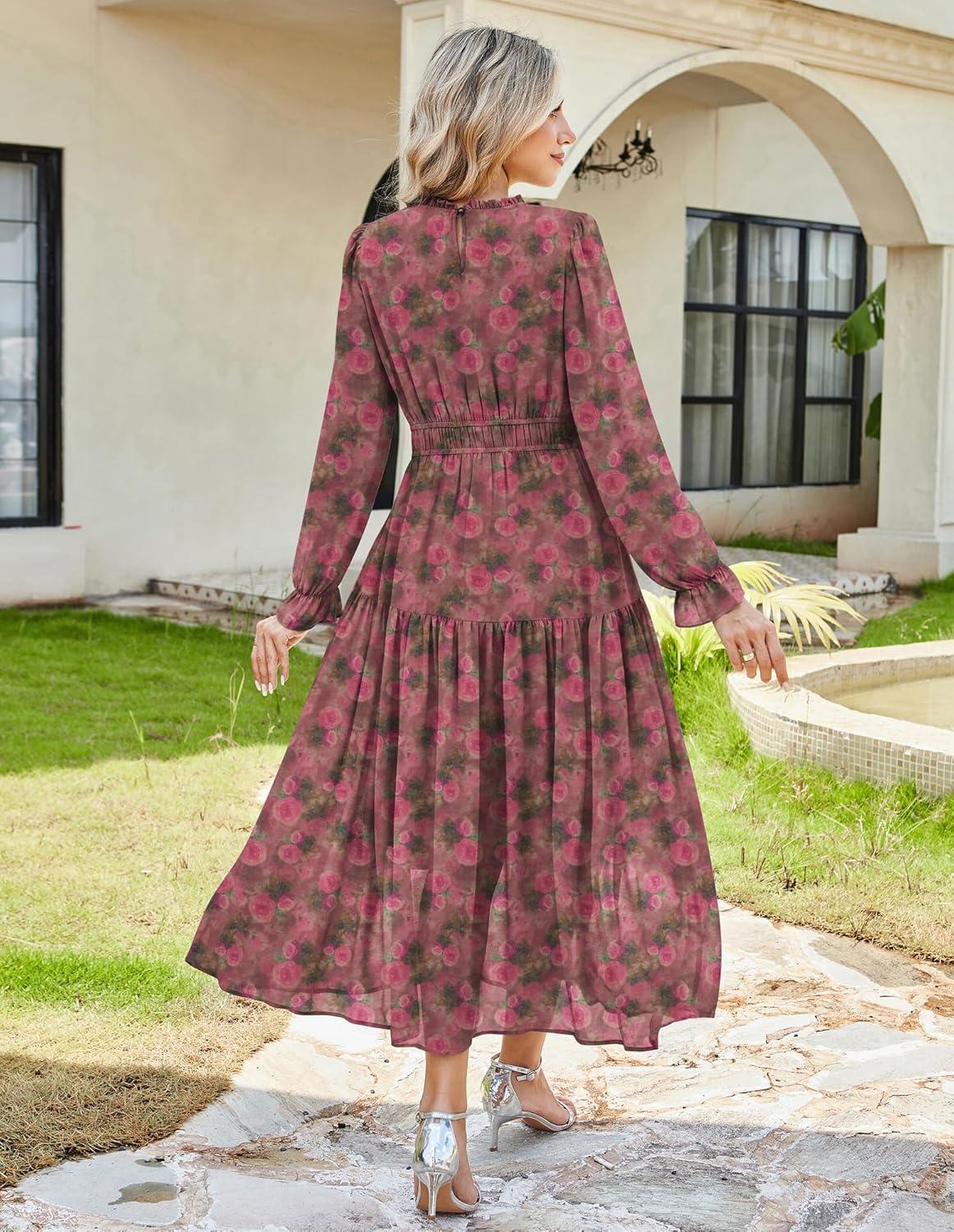 GRACE KARIN Women's Long Sleeve Maxi Dress Fall 2025 Chiffon Flowy Wedding Guest Dresses Floral Tiered Dress with Pockets(Vintage Rose Pink Floral)