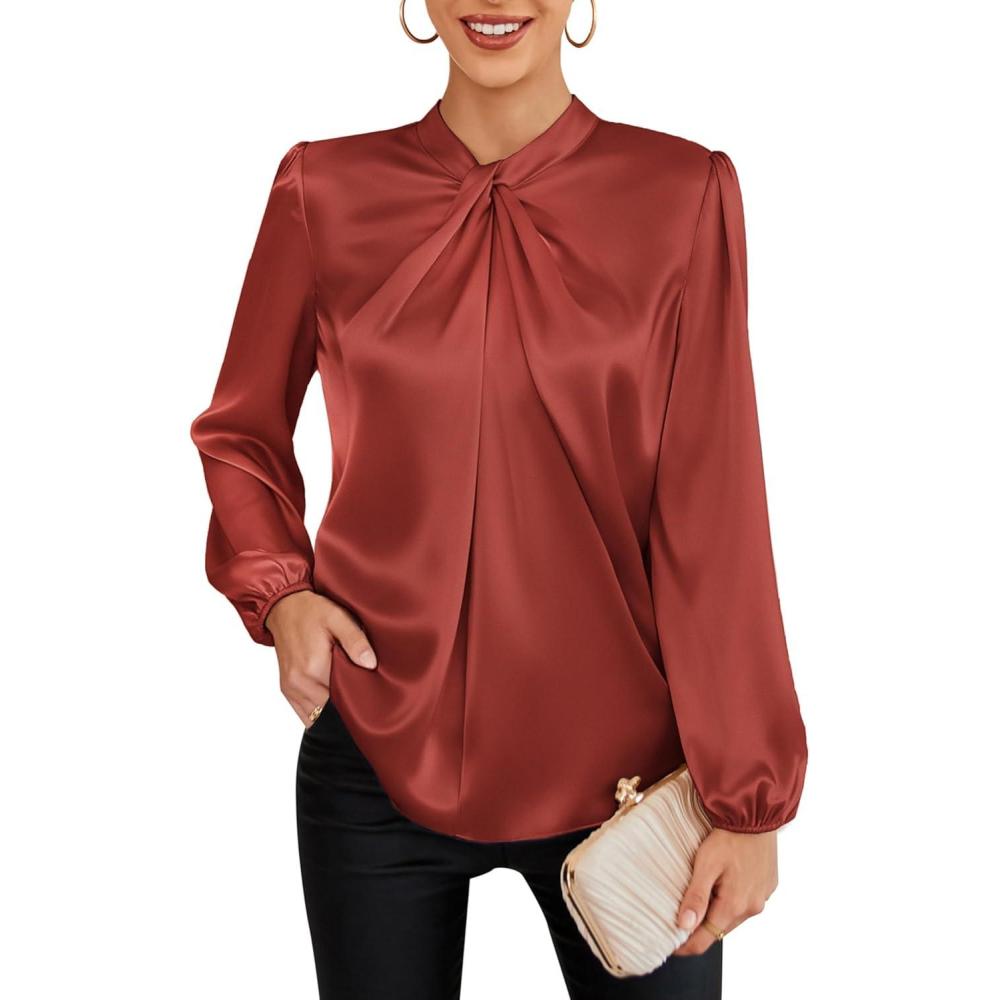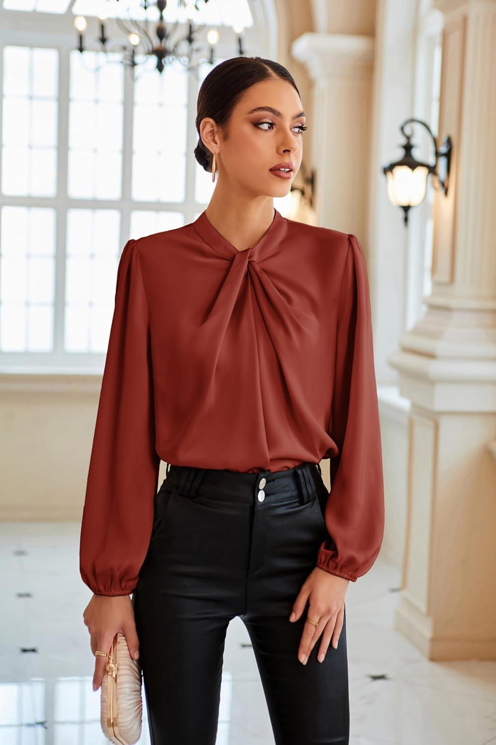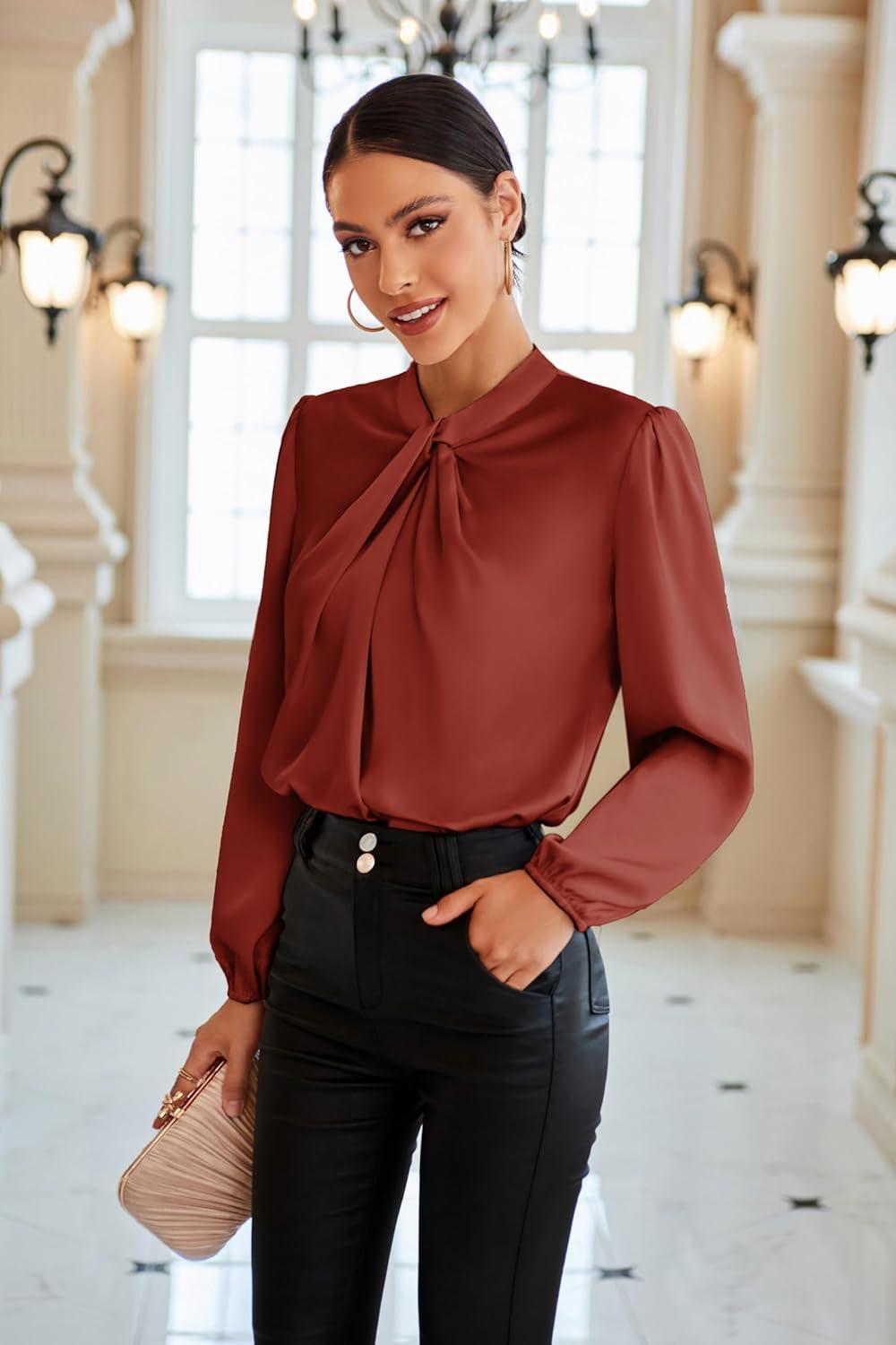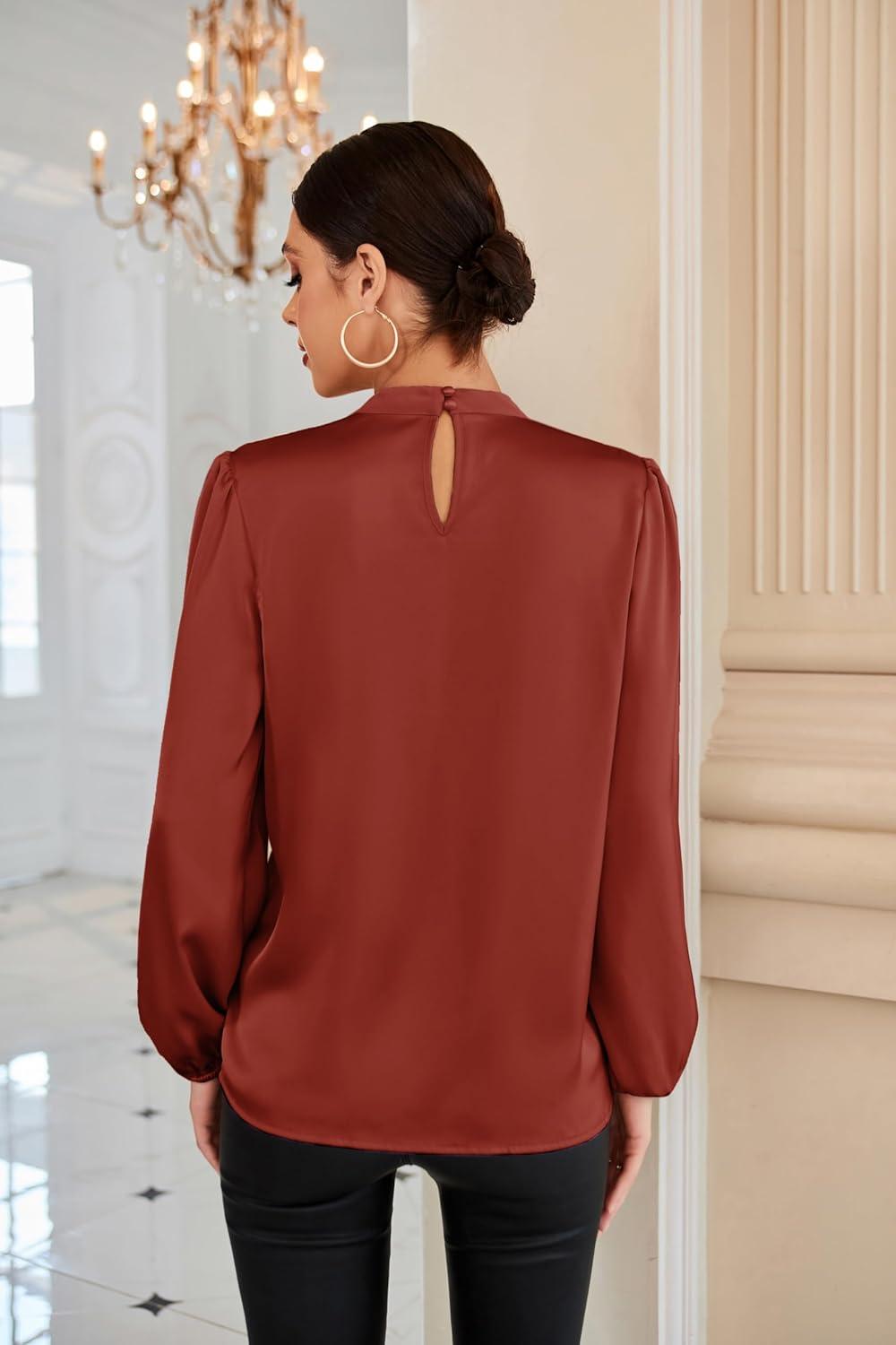 GRACE KARIN Women's Long Sleeve Satin Blouse,Mock Neck Work Silk Shirts,Dressy Tops for Business Casual Office(Brick Red)
