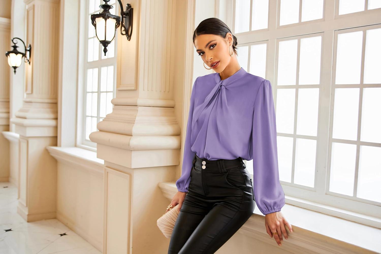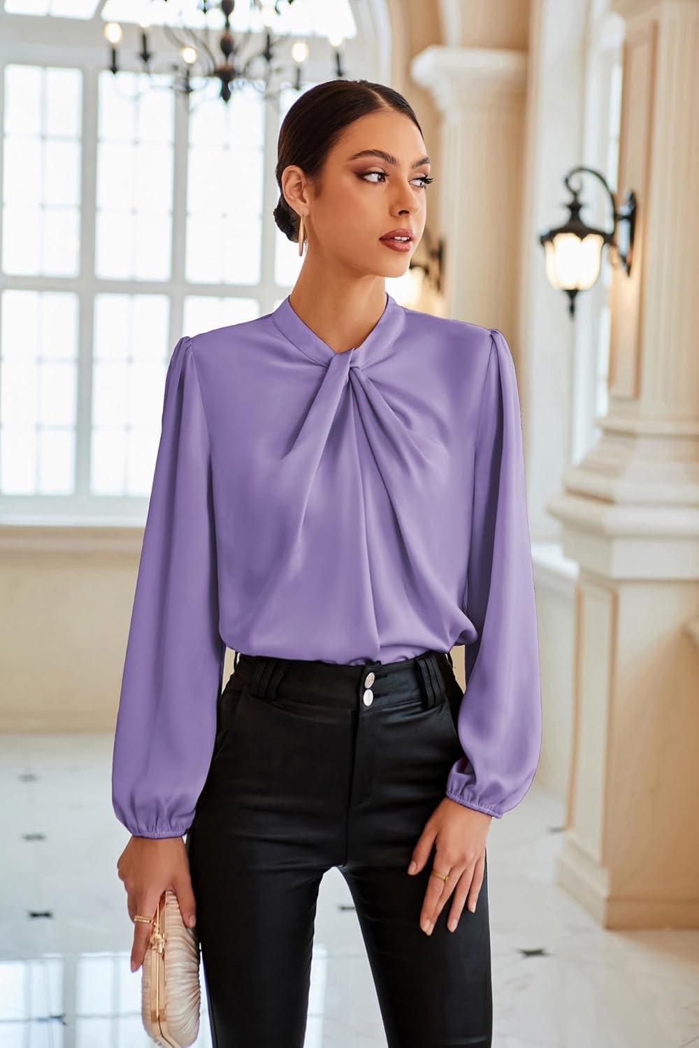 GRACE KARIN Women’s Long Sleeve Satin Blouse,Mock Neck Work Silk Shirts,Dressy Tops for Business Casual Office(Light Purple)
