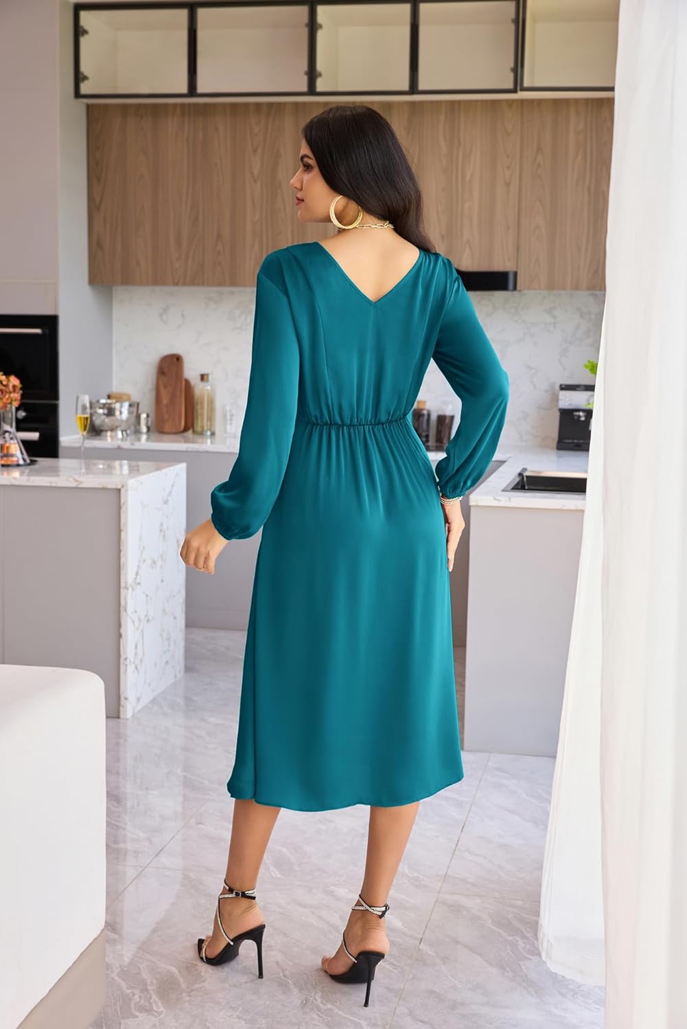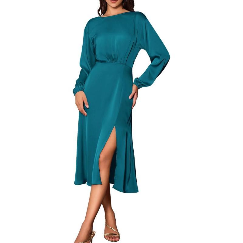 GRACE KARIN Womens Long Sleeve Satin Wedding Guest Dress with Slit Elegant Boat Neck High Waist ALine Midi DressPeacock Blue