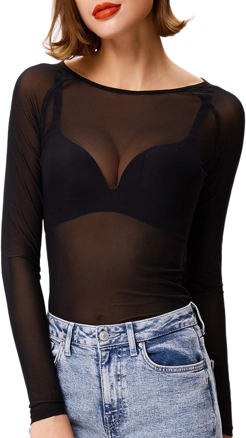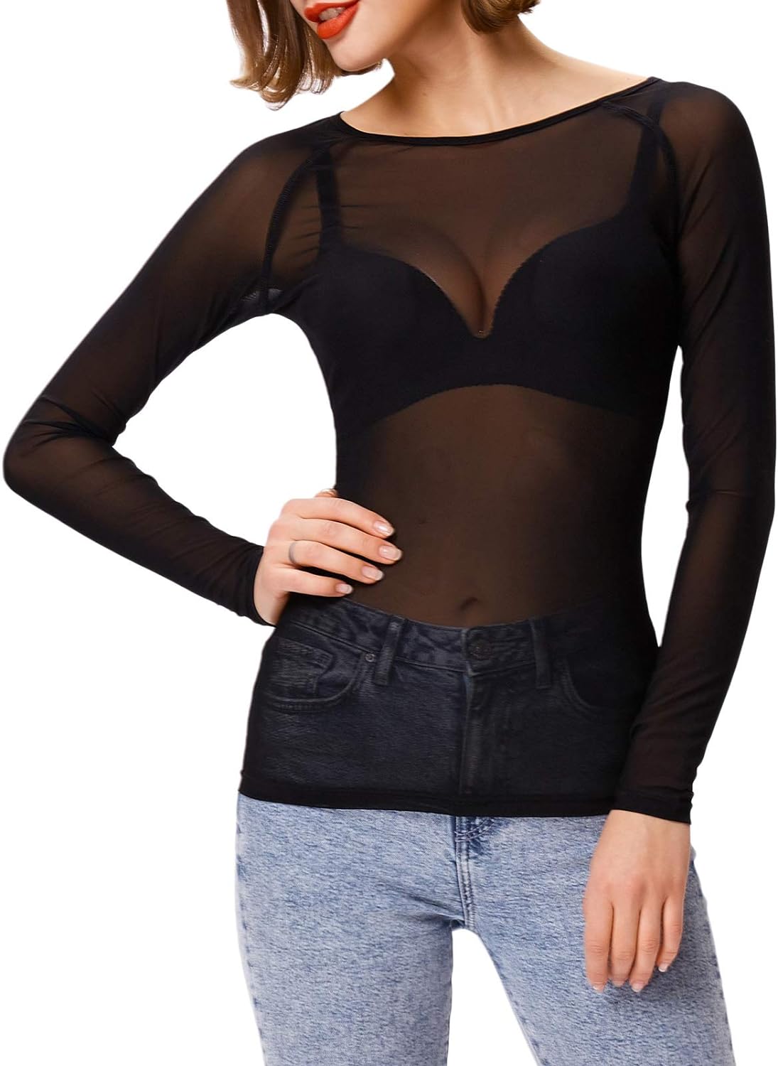 GRACE KARIN Women’s Long Sleeve See Through Mesh Sheer Top Blouse Shirt(Black)