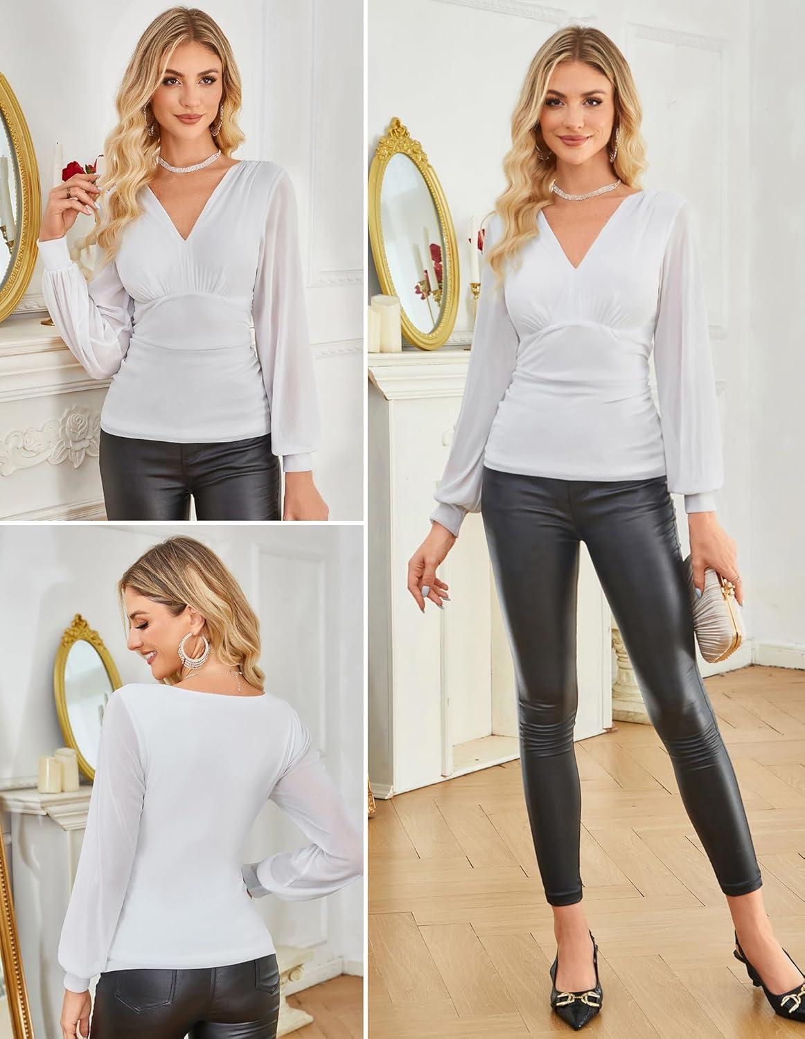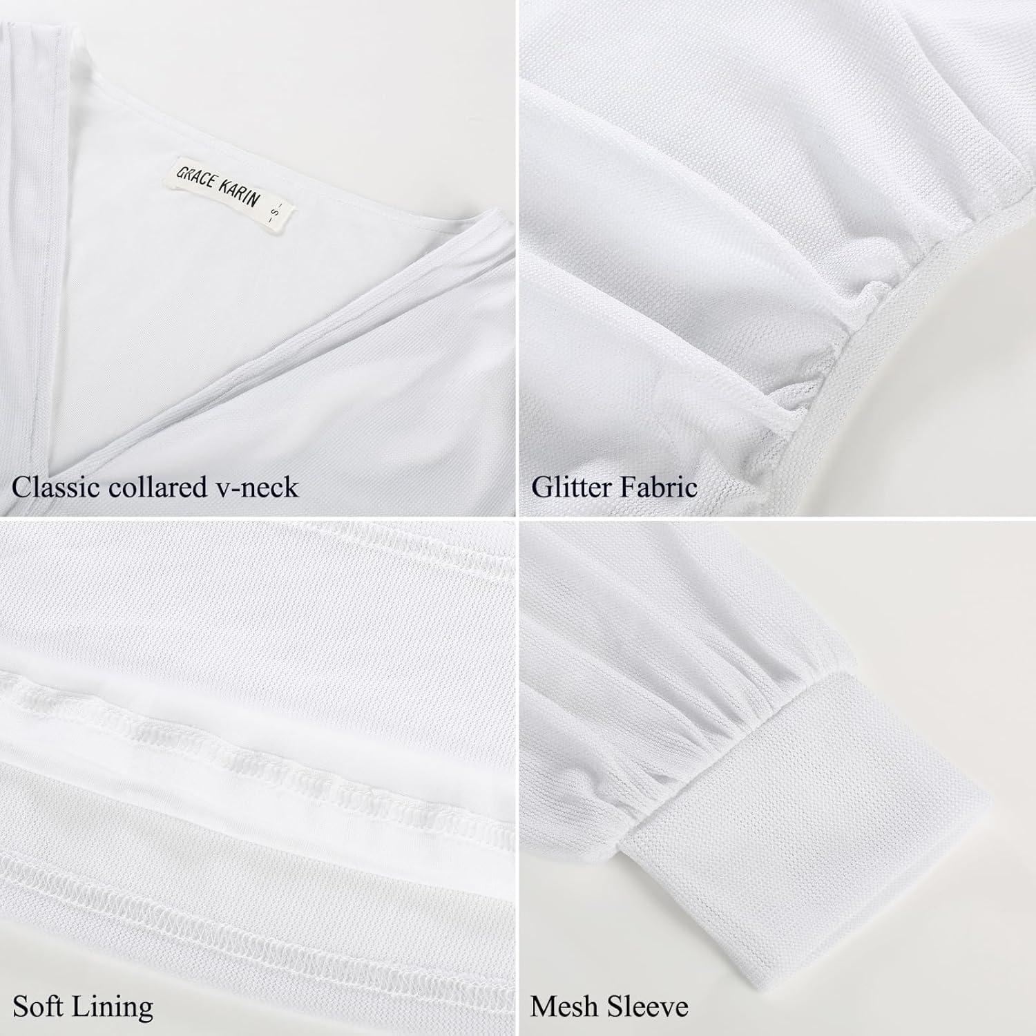 GRACE KARIN Womens Long Sleeve Sparkly Tops, V Neck Elegant Glitter Shirts, 2025 Fall Dressy Blouses for Party Wedding Guest(White)