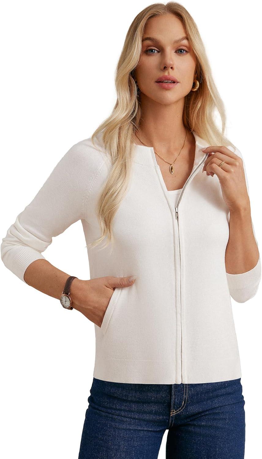 GRACE KARIN Womens Long Sleeve Zip Up Cardigan Sweaters Lightweight Zip Up Sweaters Casual Jackets Knitted Sweatershirts(Ivory White)