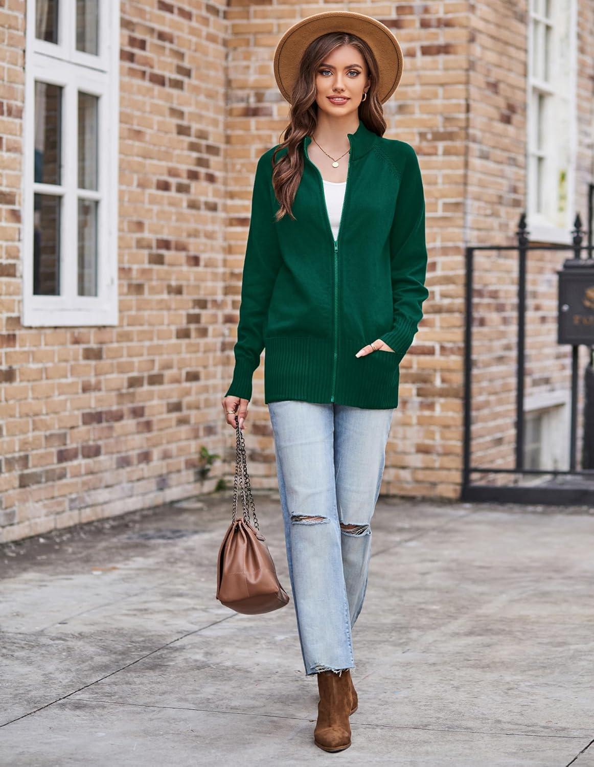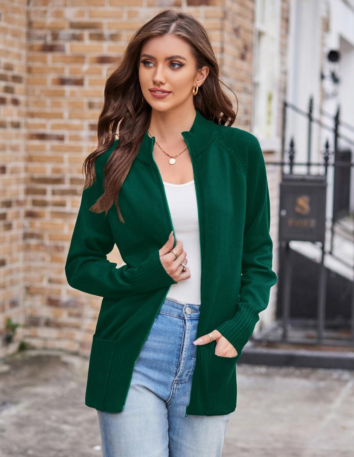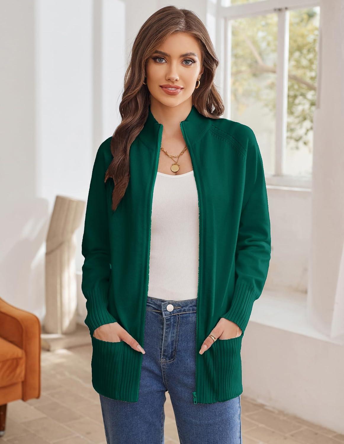 GRACE KARIN Women’s Long Sleeve Zip Up Knit Cardigan with Pockets Stand Collar Full Zip Sweater Coat Lightweight(Dark Green)