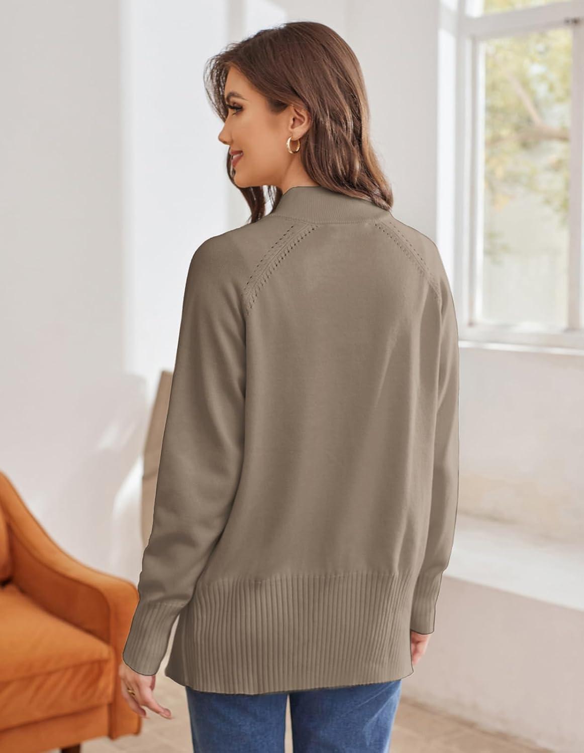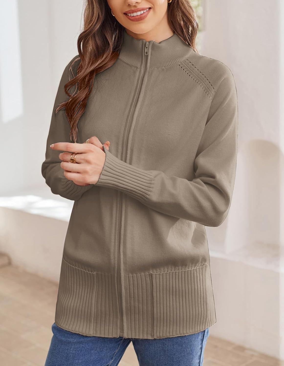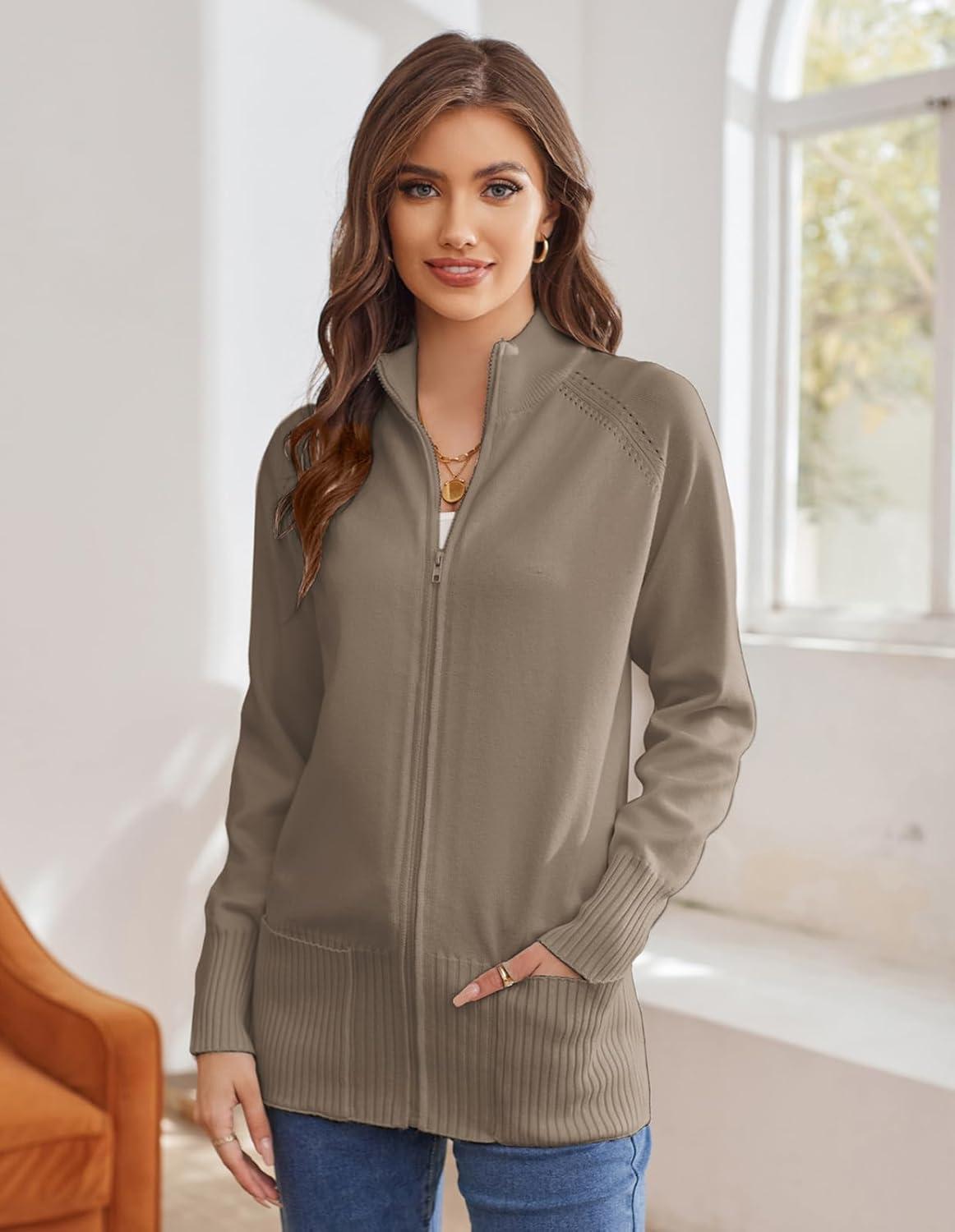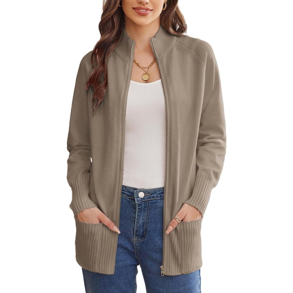 GRACE KARIN Women’s Long Sleeve Zip Up Knit Cardigan with Pockets Stand Collar Full Zip Sweater Coat Lightweight(Khaki)