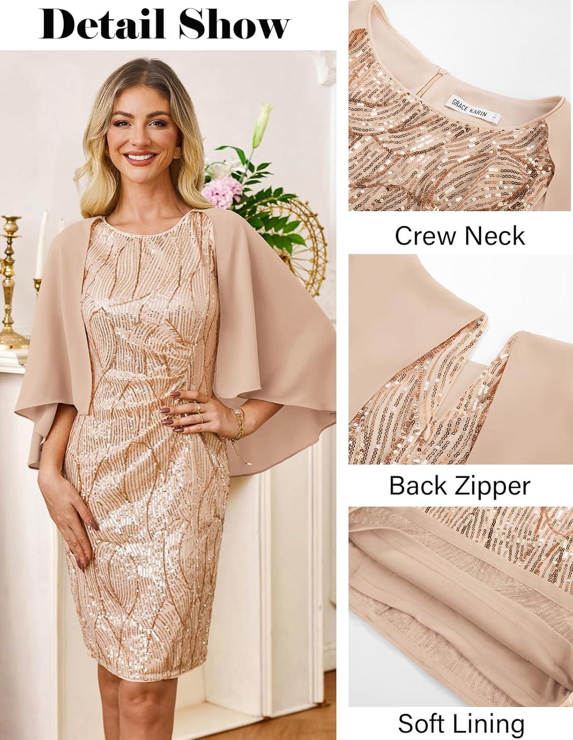 imageGRACE KARIN Womens Mother of Bride Dresses for Wedding Guest2025 Sequin Formal DressesCocktail Cape Sleeve Midi DressChampagne Gold