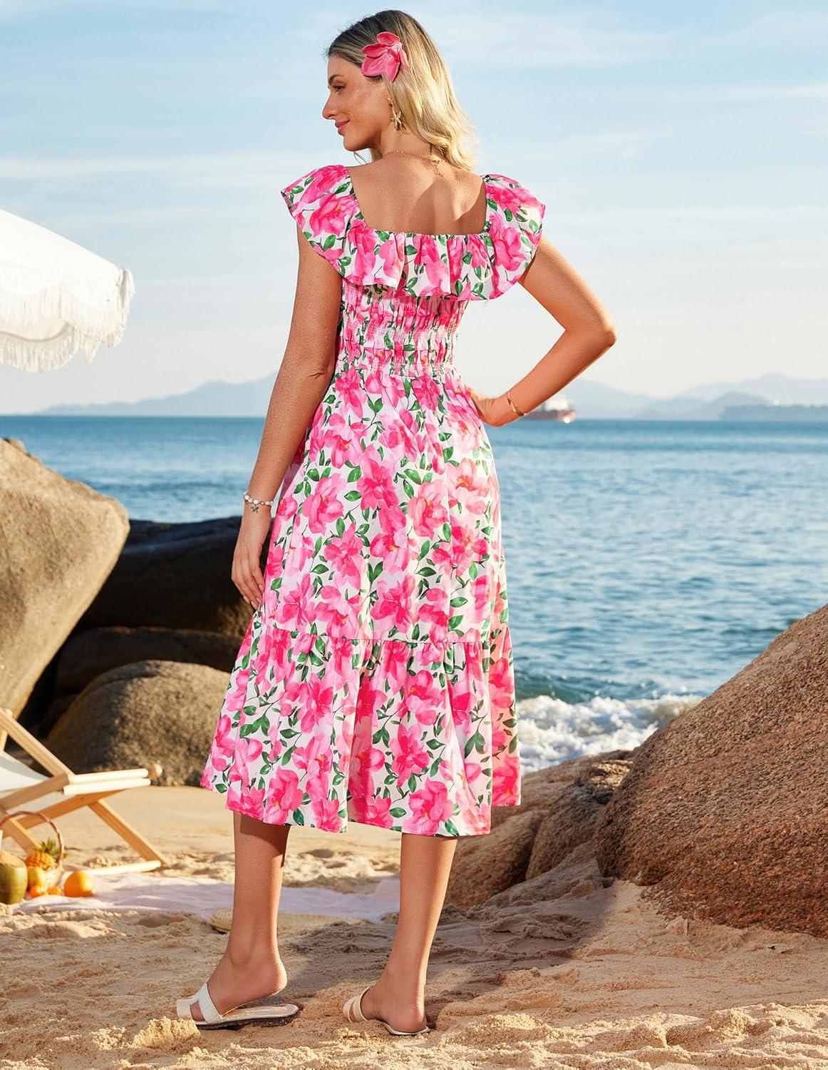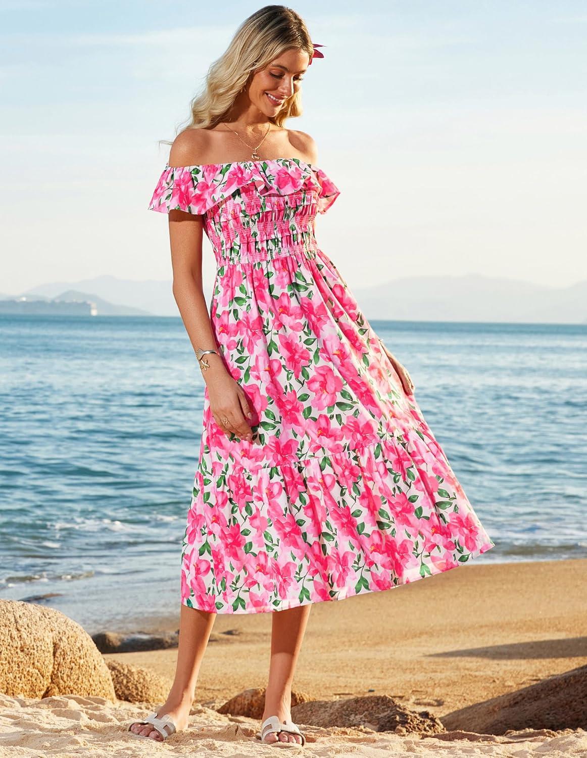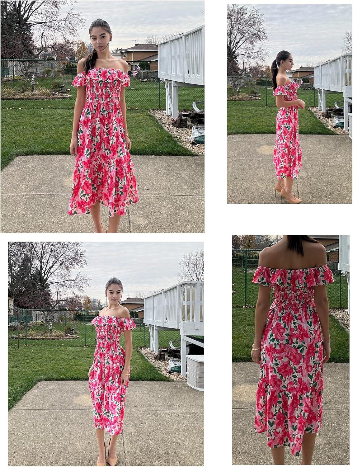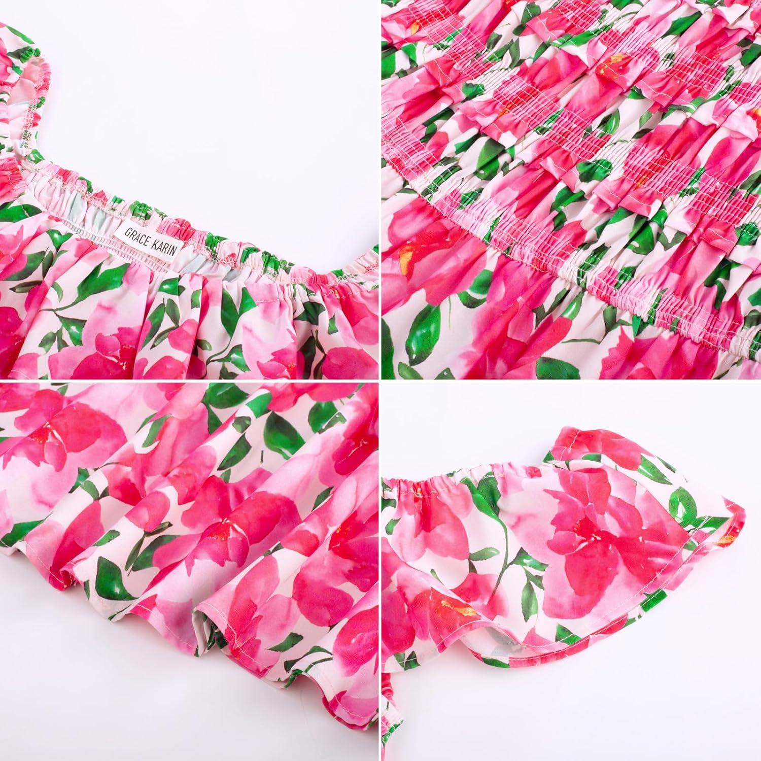 GRACE KARIN Women's Off Shoulder Floral Summer Ruffle Midi Sleeveless Boho Smocked Flowy Aline Dresses(Rose Red)