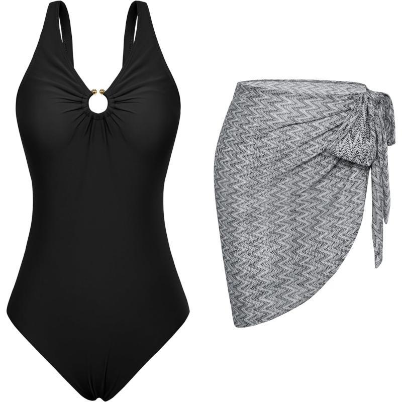 GRACE KARIN Women’s One Piece Swimsuit with Cover Up Sarong V Neck Open Back Ruched Ring Swimwear(Black)