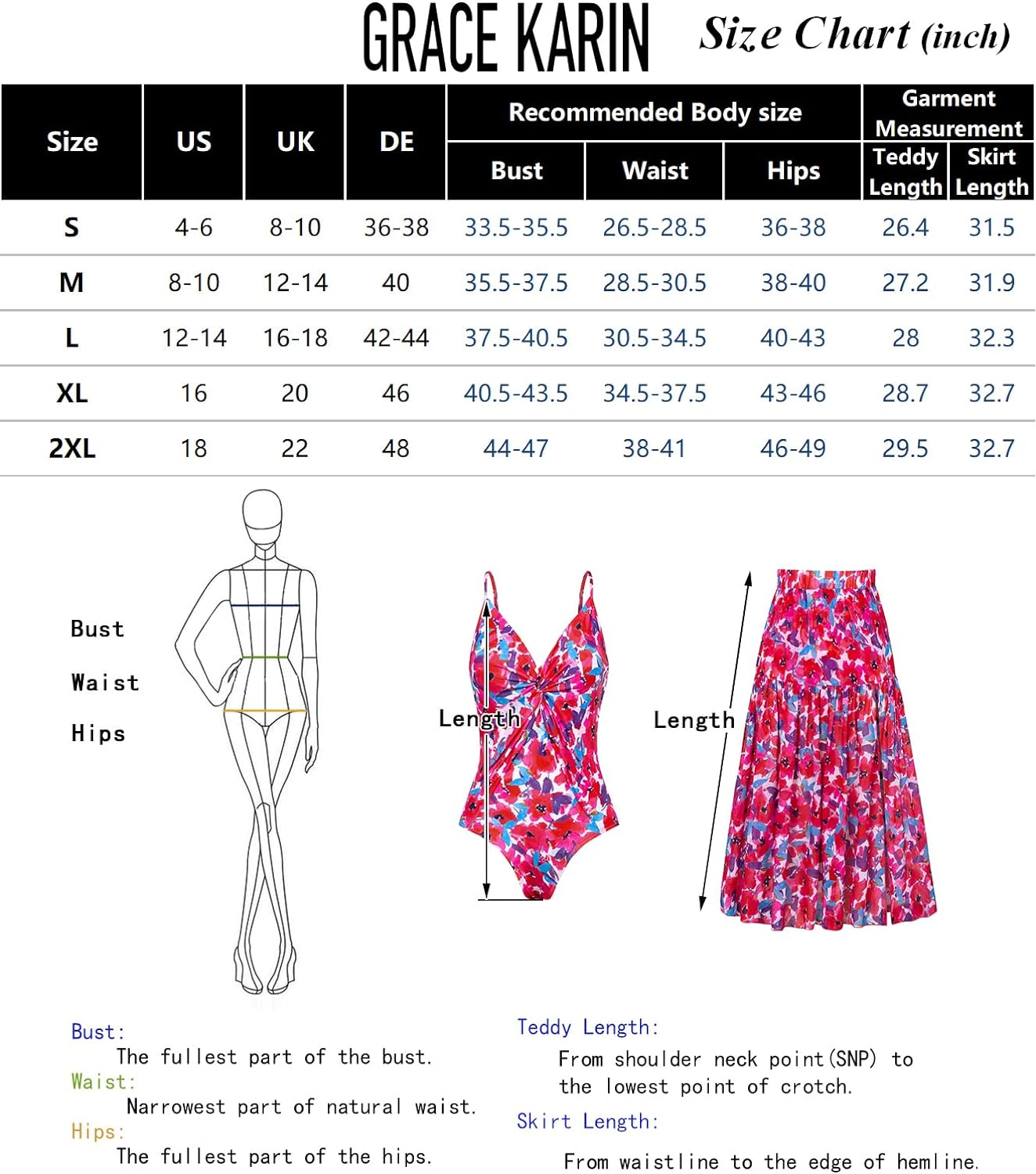 GRACE KARIN Women’s One Piece Swimsuits with Cover Up Skirt Tummy Control V Neck Bathing Suits(Blue Floral)