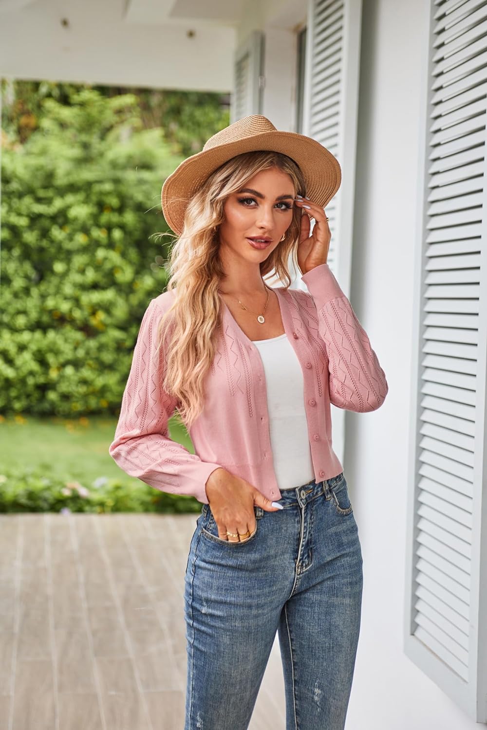 GRACE KARIN Women’s Open Front Knit Cropped Bolero Shrug Cardigan Sweater Long Sleeve (S-4XL)(Pink (Hollow Out))