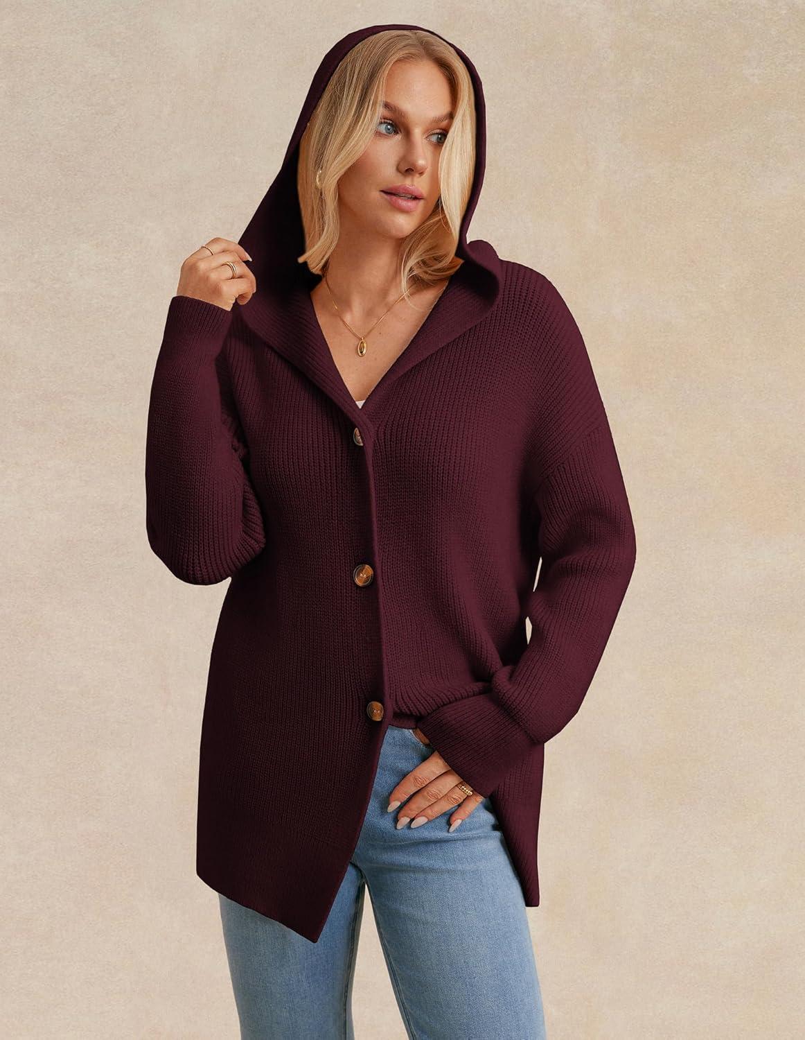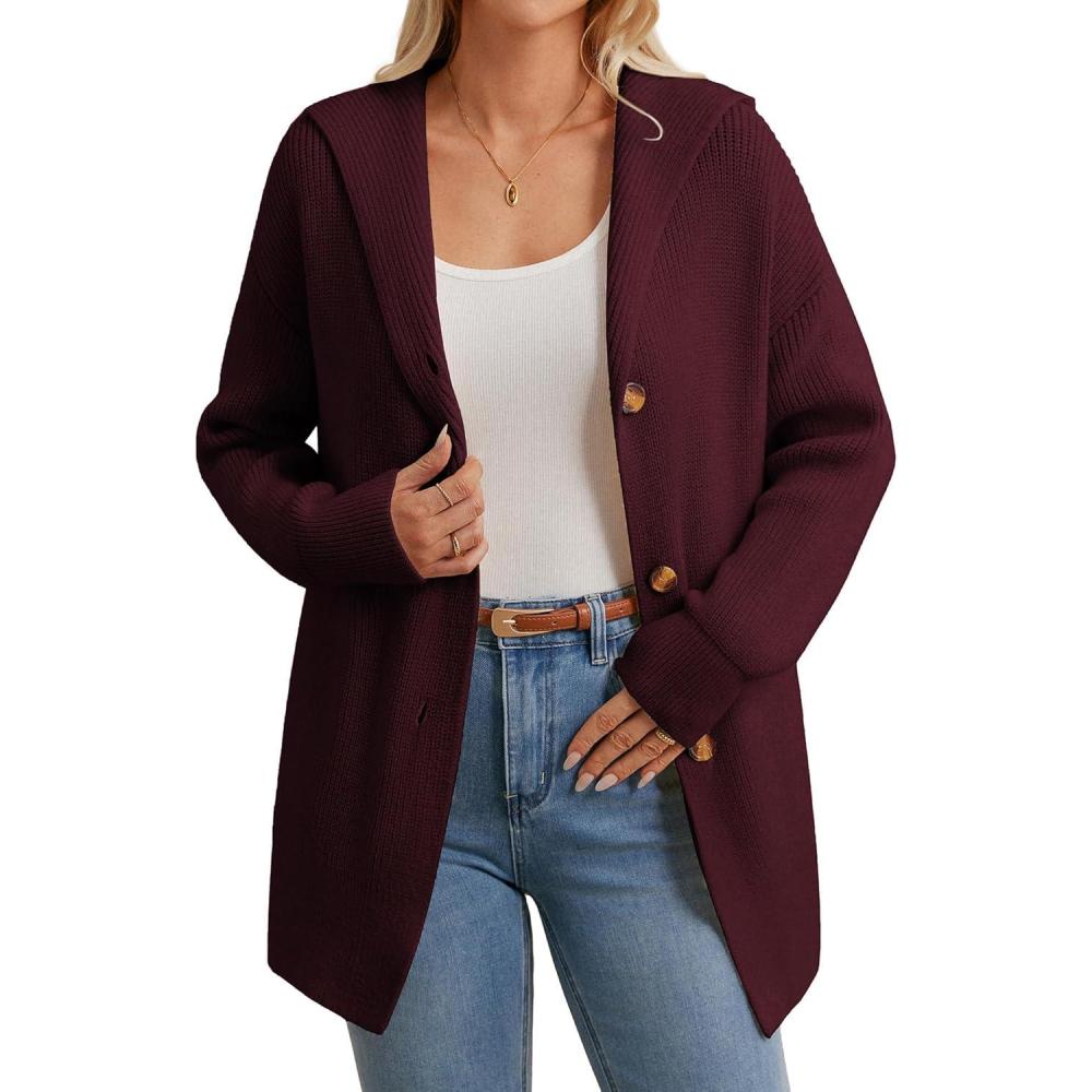 GRACE KARIN Womens Oversized Hooded Cardigan Sweaters 2025 Trendy Fall Outfits Button Up Knit Sweater Coats with Pockets(Wine Red)