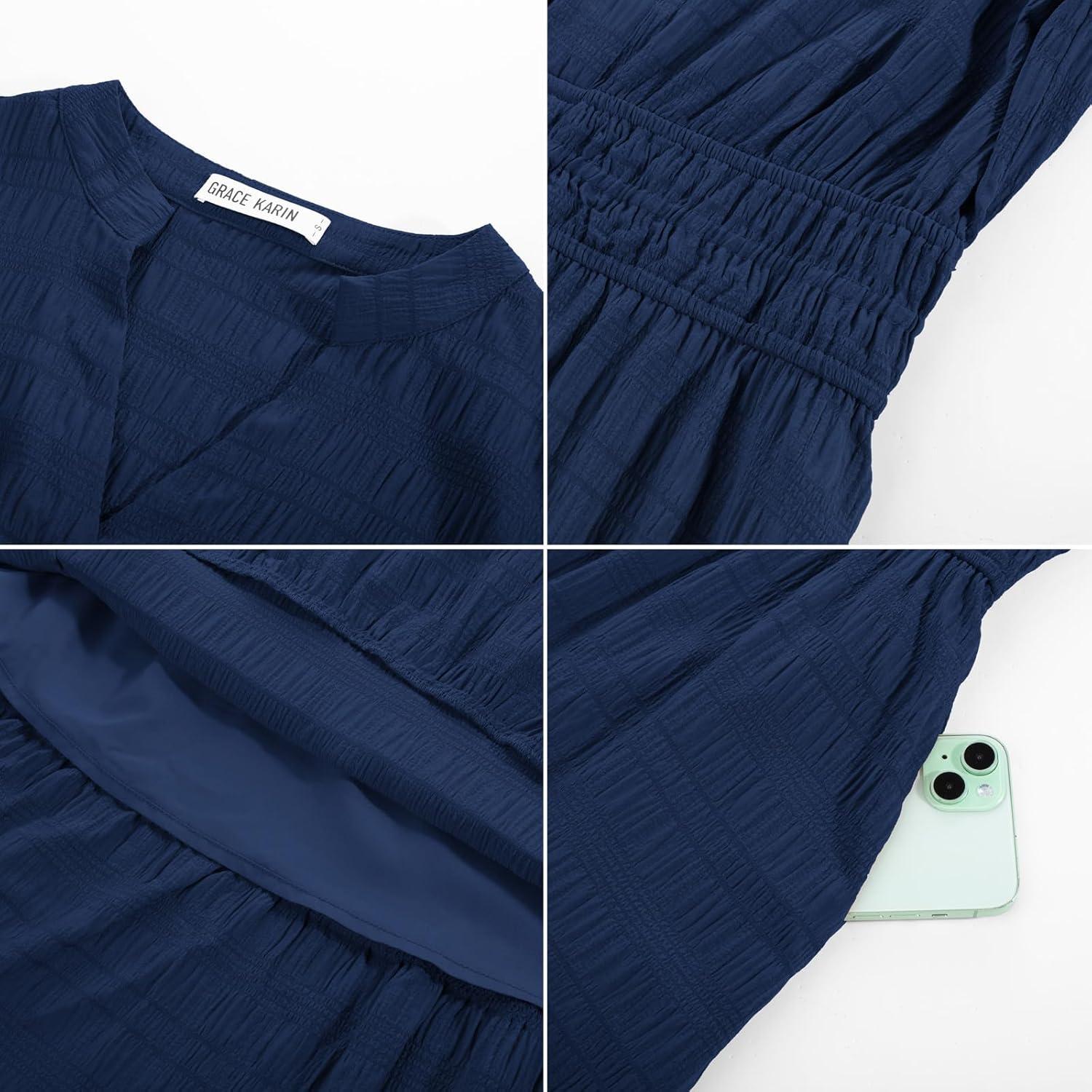 GRACE KARIN Women's Puff Long Sleeve V Neck Smocked Maxi Dress Tiered A-line Spring Fall Flowy Long Dress with Pockets(Navy)
