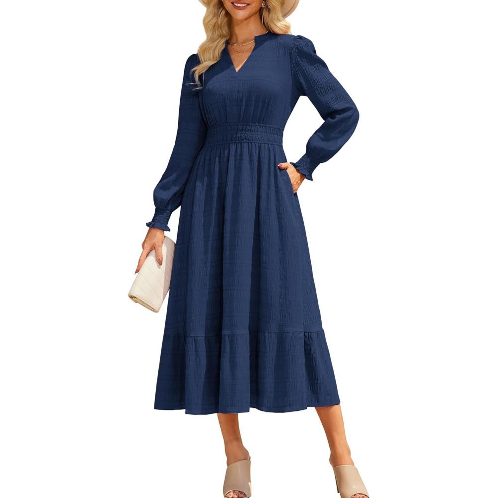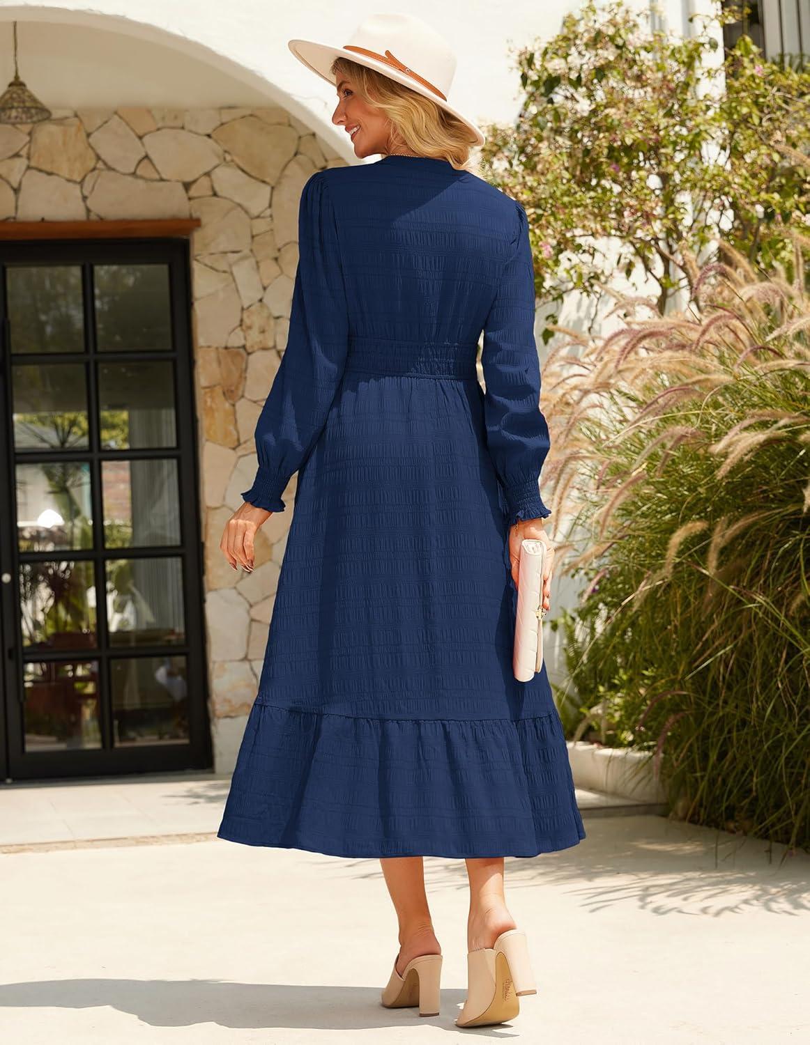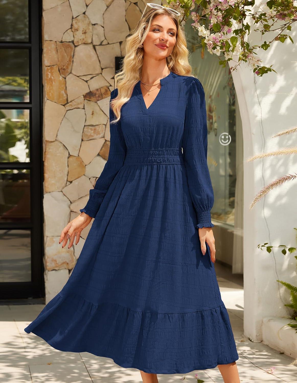 imageGRACE KARIN Womens Puff Long Sleeve V Neck Smocked Maxi Dress Tiered Aline Spring Fall Flowy Long Dress with PocketsNavy