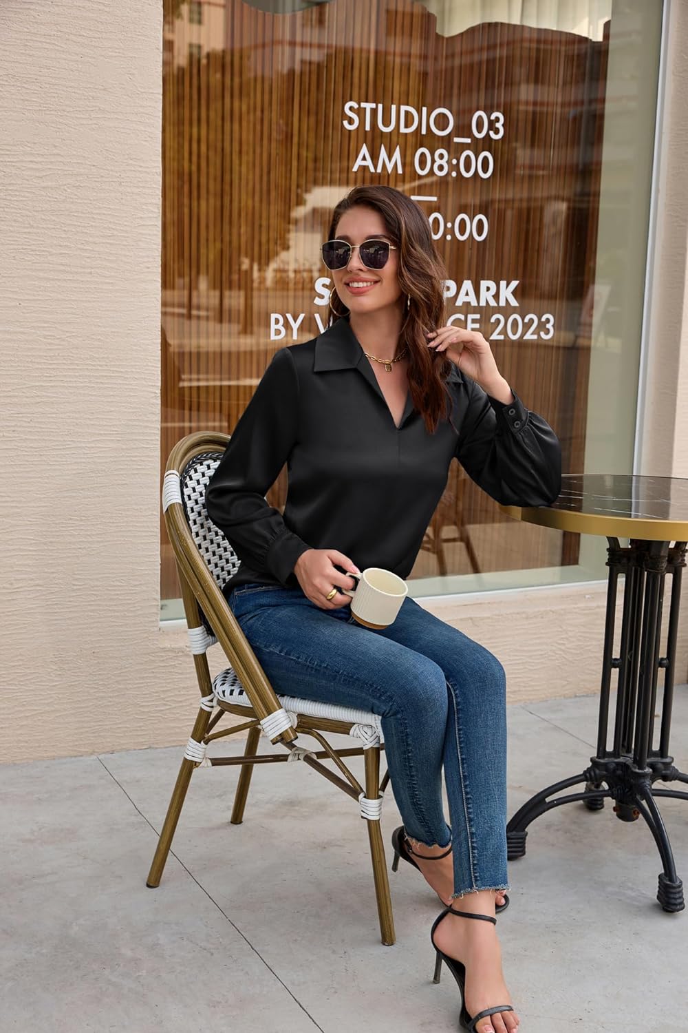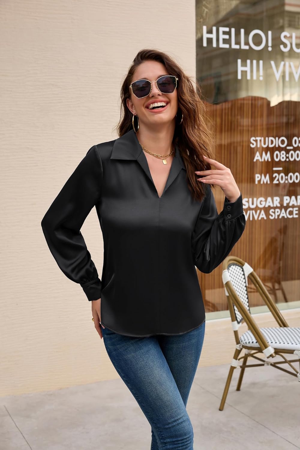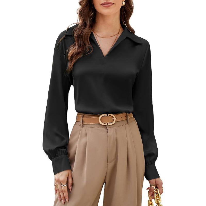 GRACE KARIN Womens Satin Silk Blouse Lapel V Neck Long Sleeve Casual Work Blouse Shirts Pullover TopsBlack