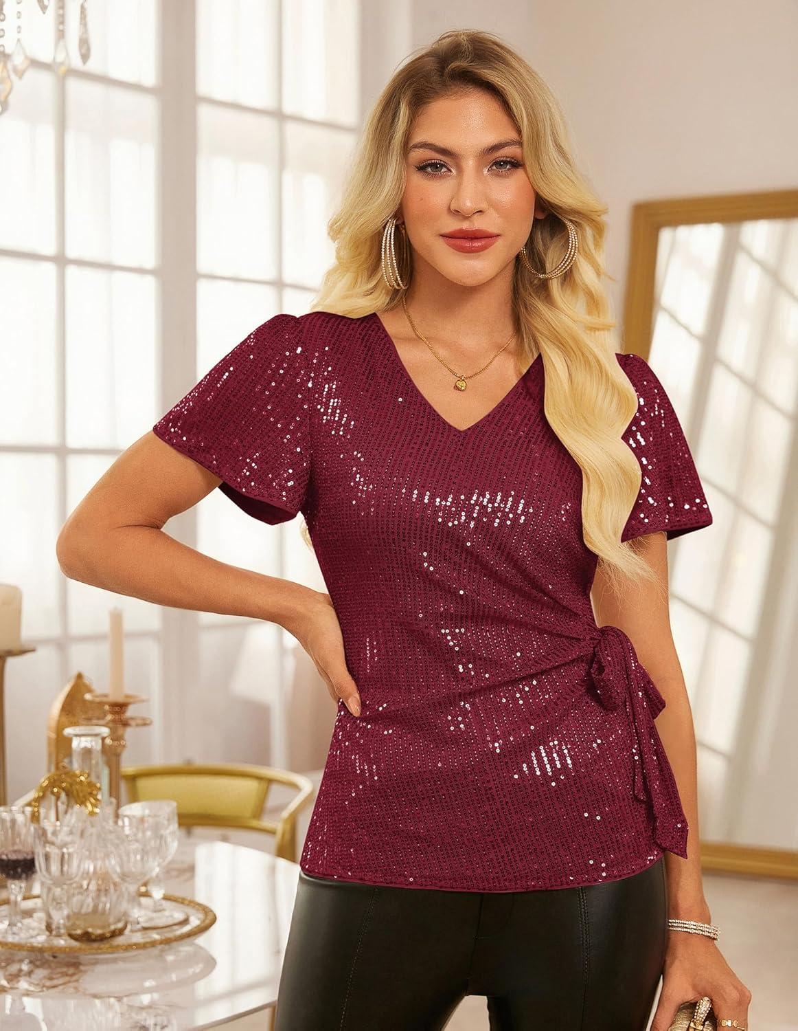 GRACE KARIN Womens Sequin Tops 2025 Ruffle Sleeve Sparkly Shirt, Glitter Party Blouses Dressy Concert Disco Outfits(Burgundy)