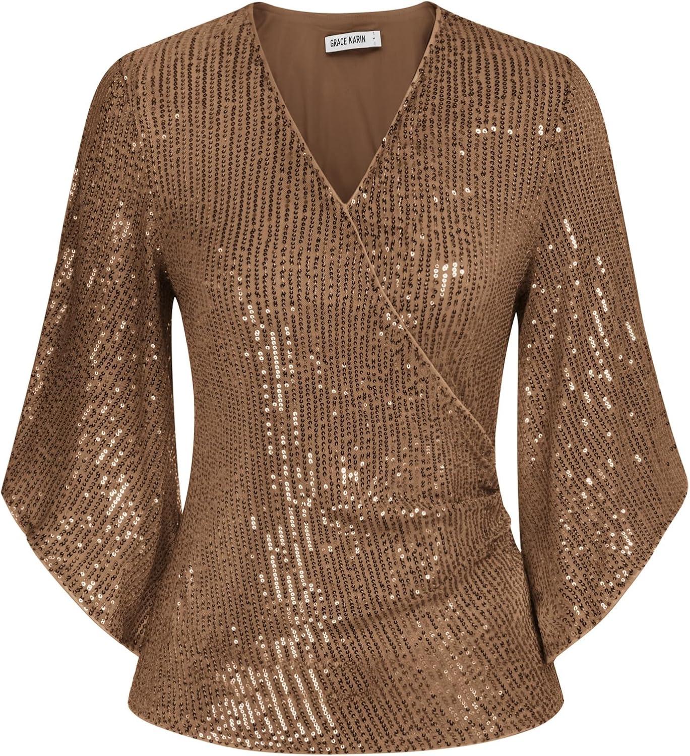 GRACE KARIN Womens Sequin Tops 3/4 Sleeve Glitter Sparkly Shimmer Party Dressy Blouse V-Neck Disco Club Concert Shirts(Brown)