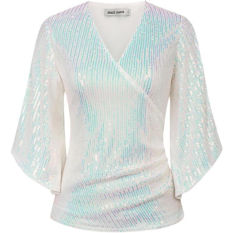 GRACE KARIN Womens Sequin Tops 3/4 Sleeve Glitter Sparkly Shimmer Party Dressy Blouse V-Neck Disco Club Concert Shirts(Colorful Silvery)
