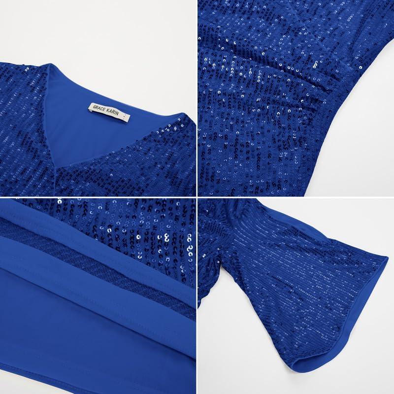 GRACE KARIN Womens Sequin Tops 3/4 Sleeve Glitter Sparkly Shimmer Party Dressy Blouse V-Neck Disco Club Concert Shirts(Royal Blue)