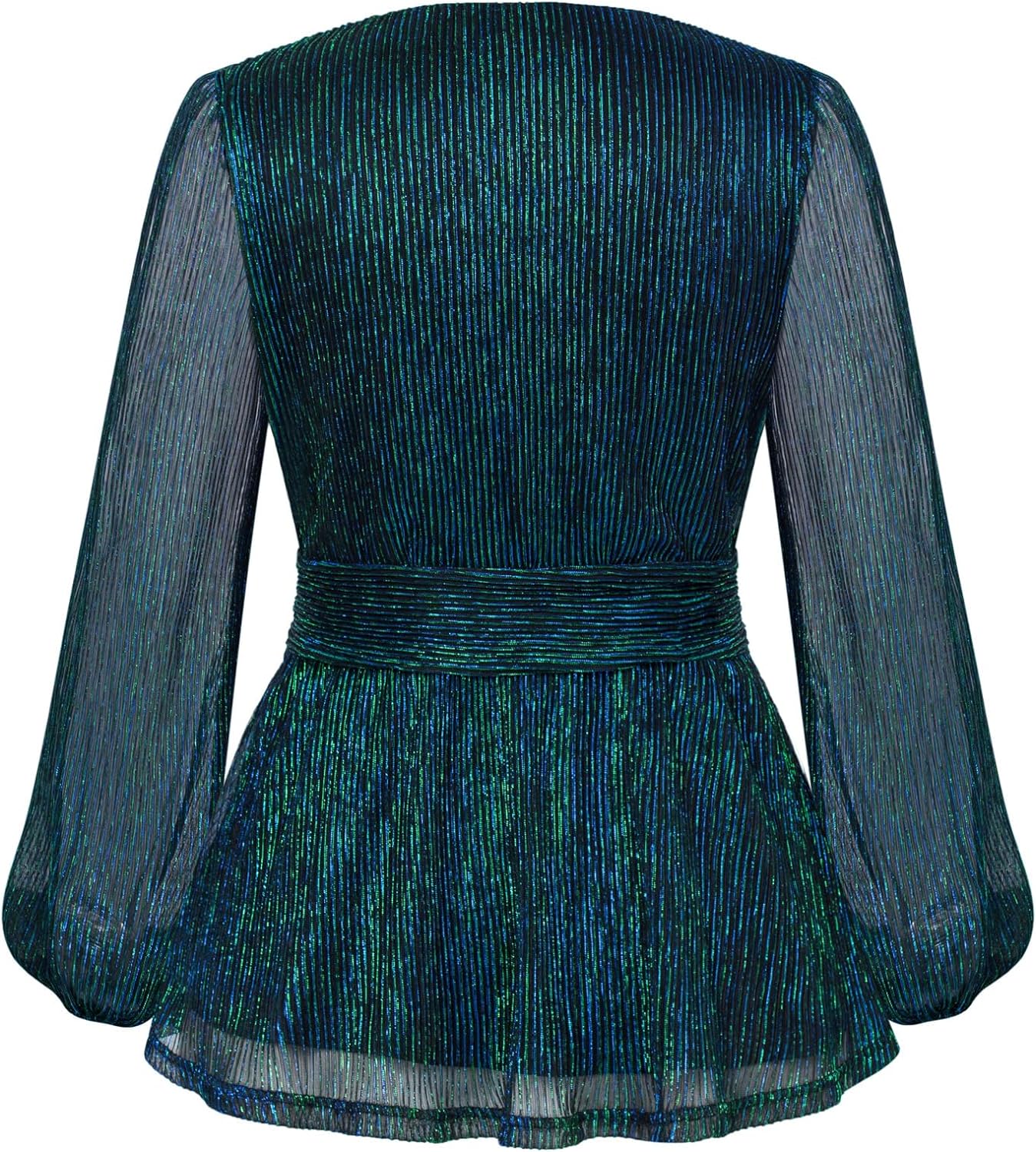 GRACE KARIN Women’s Sequin Tops V-Neck Waist Pleat Blouse Lantern Sleeves Sparkly Peplum Tops(Blue-green)