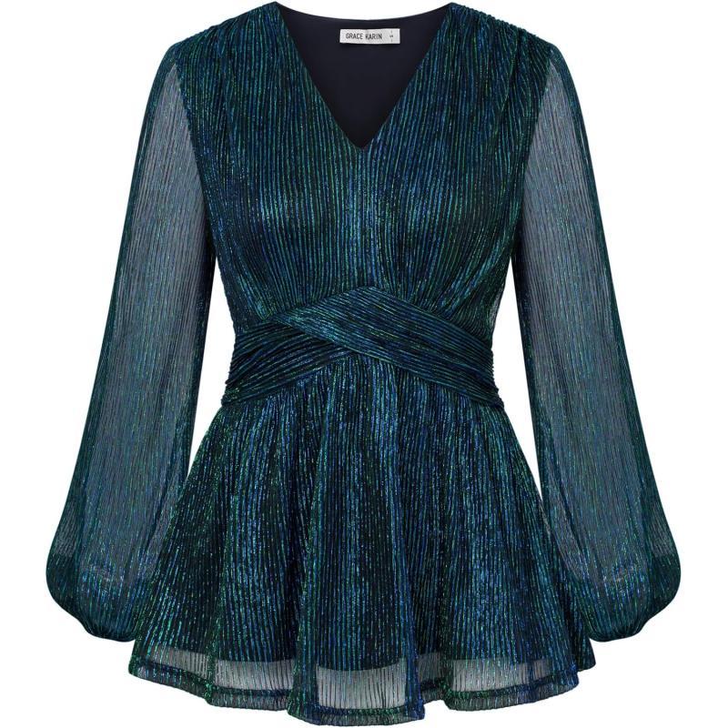 GRACE KARIN Women's Sequin Tops V-Neck Waist Pleat Blouse Lantern Sleeves Sparkly Peplum Tops(Blue-green)