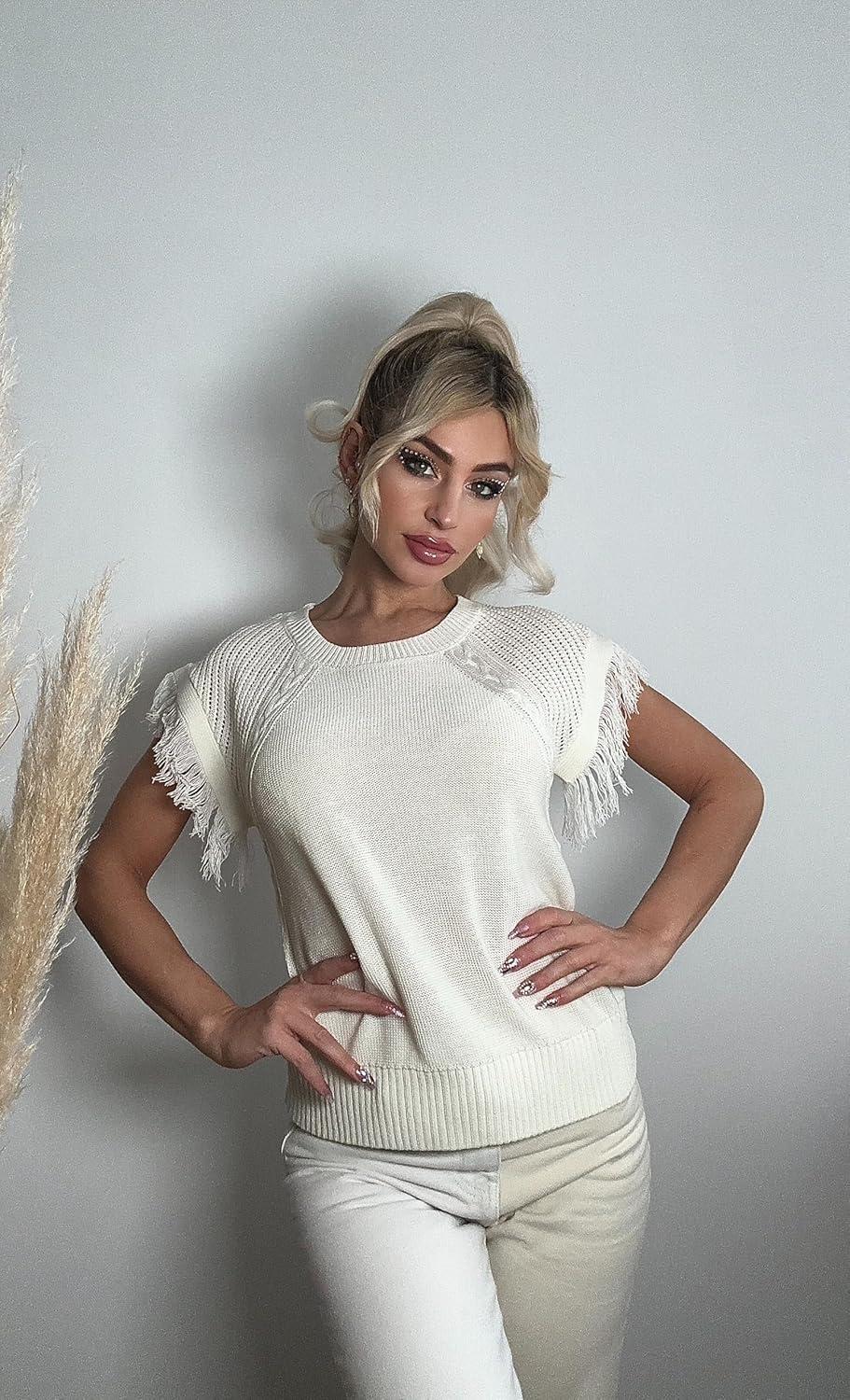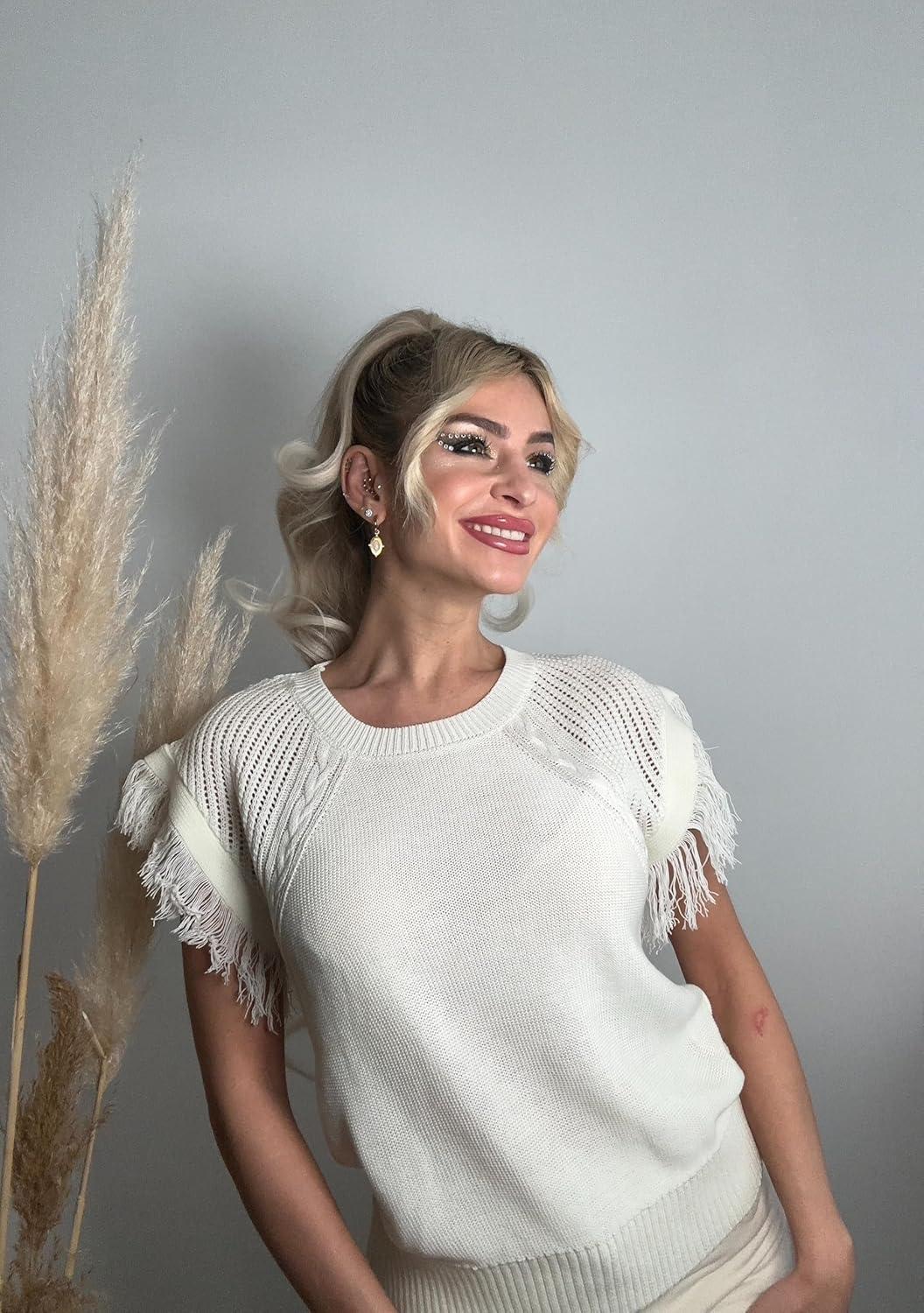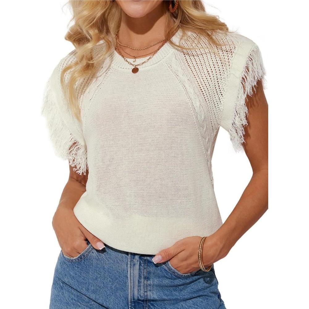 GRACE KARIN Womens Sleeveless Sweater Vest Fringe Cap Sleeve Sweater Casual Crew Neck Loose Fit Pullover Tank Tops S-2XL(Cream White)