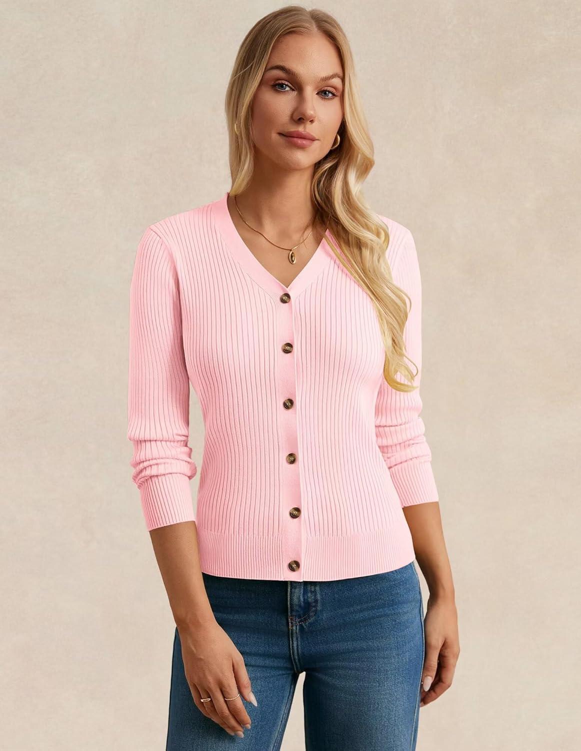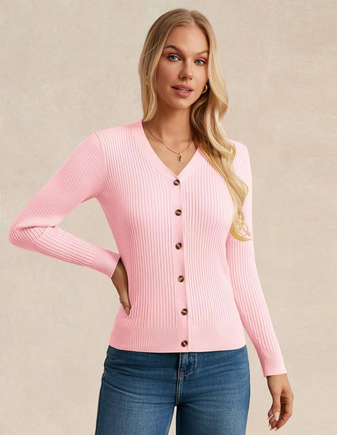 GRACE KARIN Women's Soft Knit Cardigan Sweater - Long Sleeve V-Neck Button Up for Business Casual & Lounge Wear(Pink)