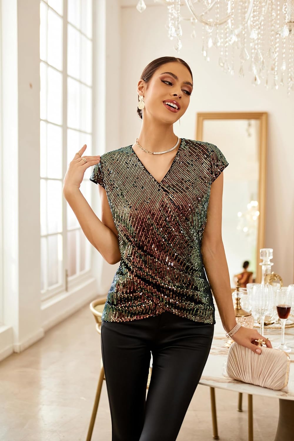 【Features】Sparkle top is beautifully designed with full shiny sequin cover, fully lined, wrap v neck, cap sleeve, twist front tops, plain, regular length, slim fit sparkly glitter blouse.