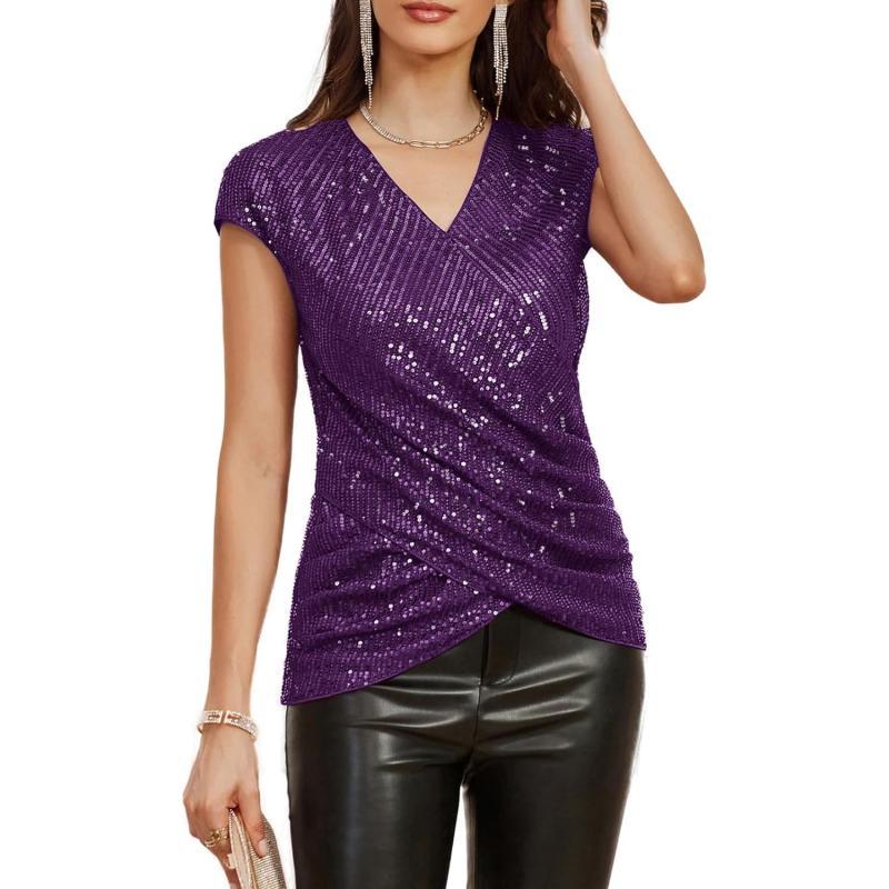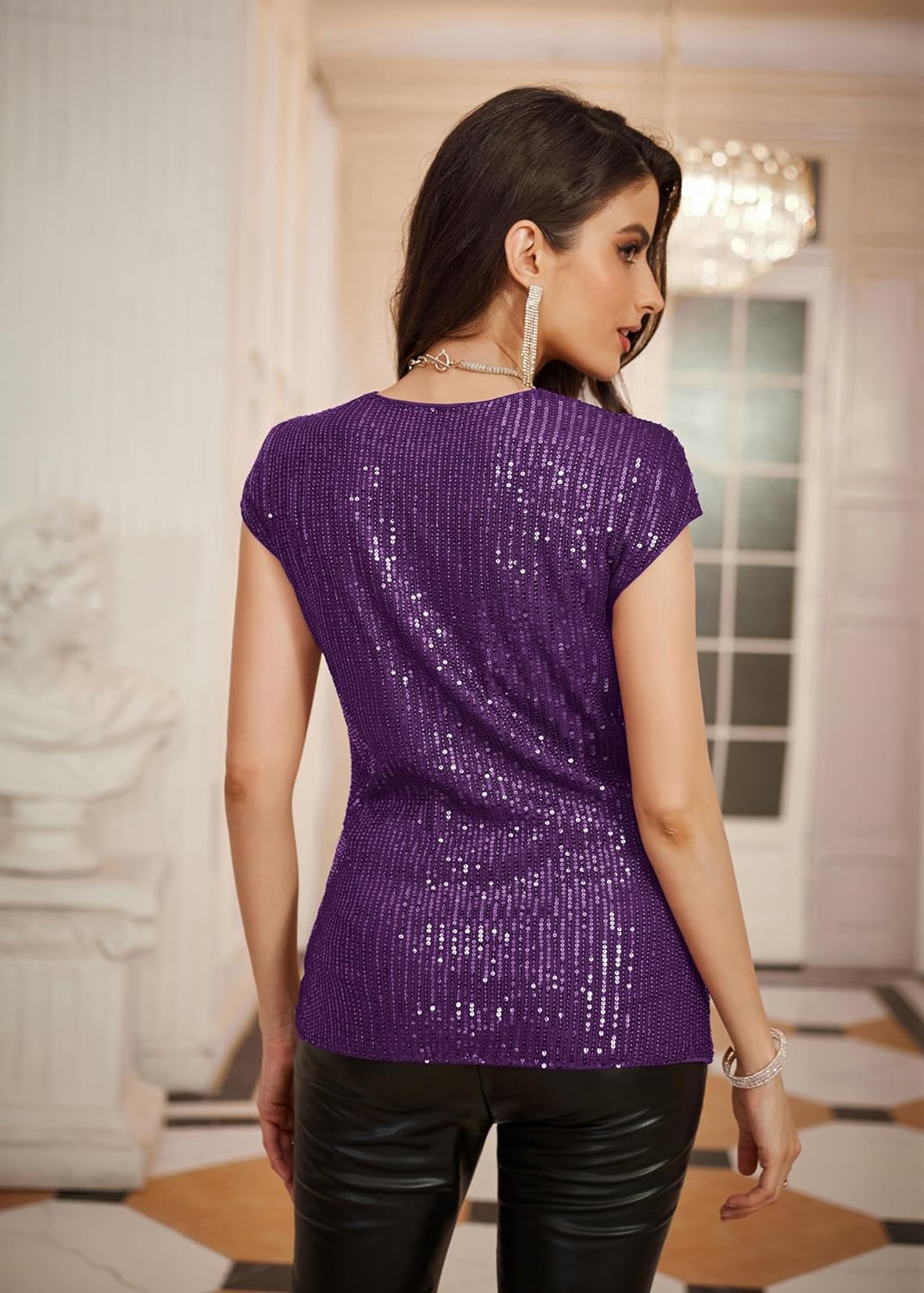 GRACE KARIN Womens Sparkle Sequin Top Shimmer Glitter Blouse Twist Front V Neck Cap Sleeve Club Party Shirt(Purple)
