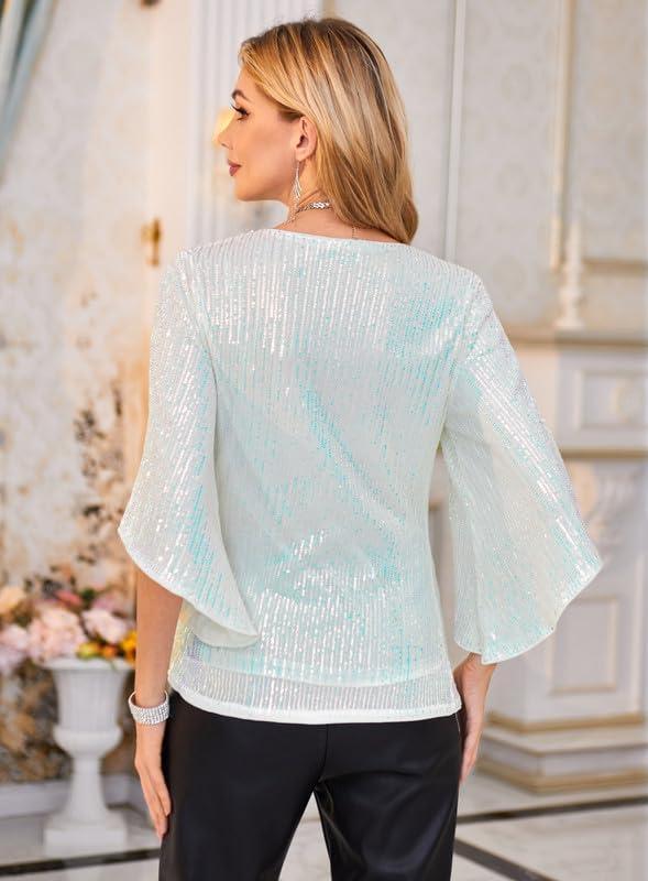 GRACE KARIN Womens Sparkly Sequin Tops,3/4 Sleeve Glitter Party Dressy Blouse,V-Neck Disco Evening Club Concert Shirt(Colorful Silvery)