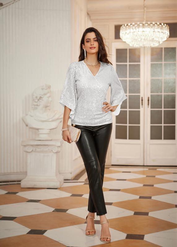 GRACE KARIN Womens Sparkly Sequin Tops,3/4 Sleeve Glitter Party Dressy Blouse,V-Neck Disco Evening Club Concert Shirt(Silver)