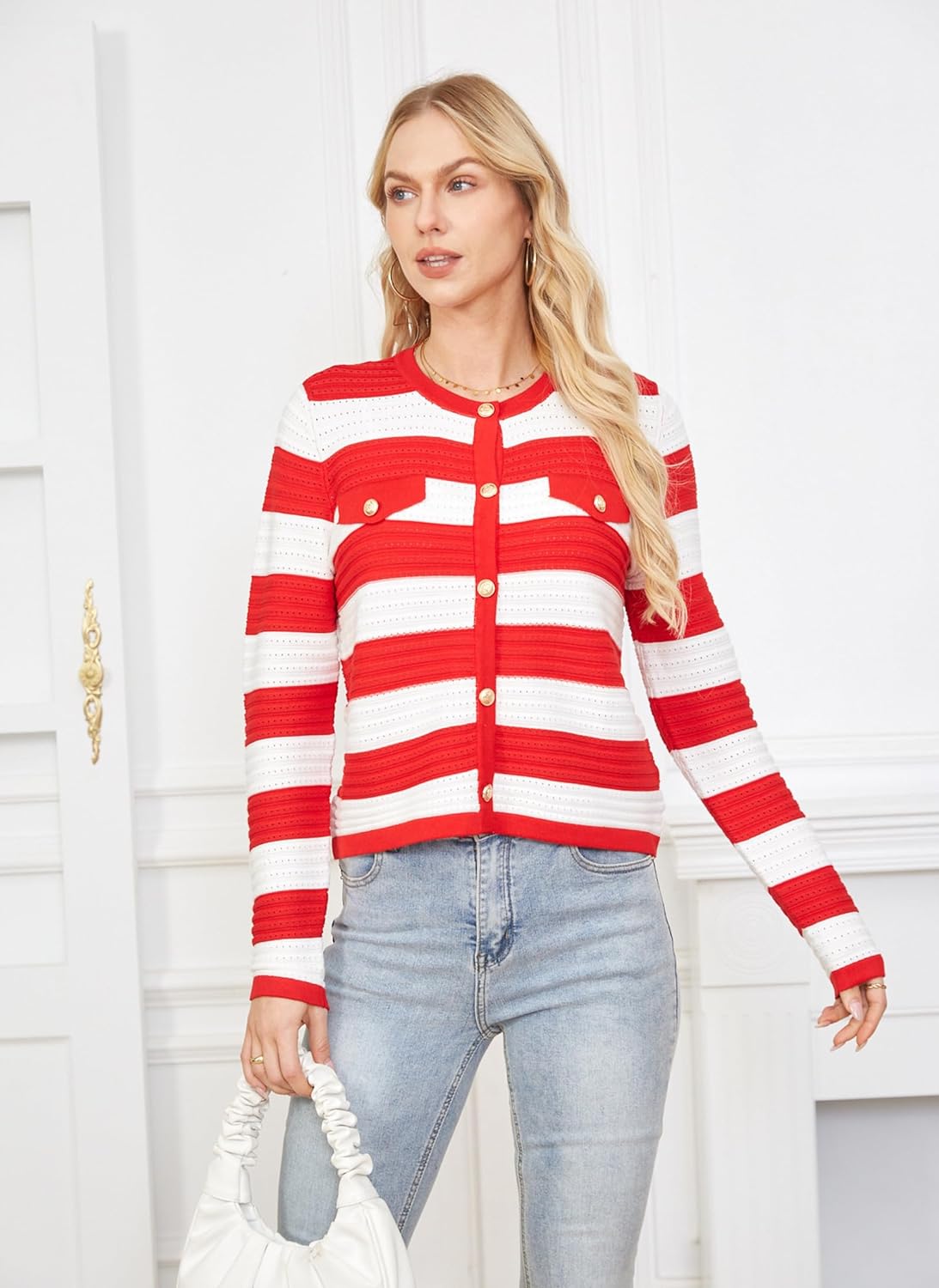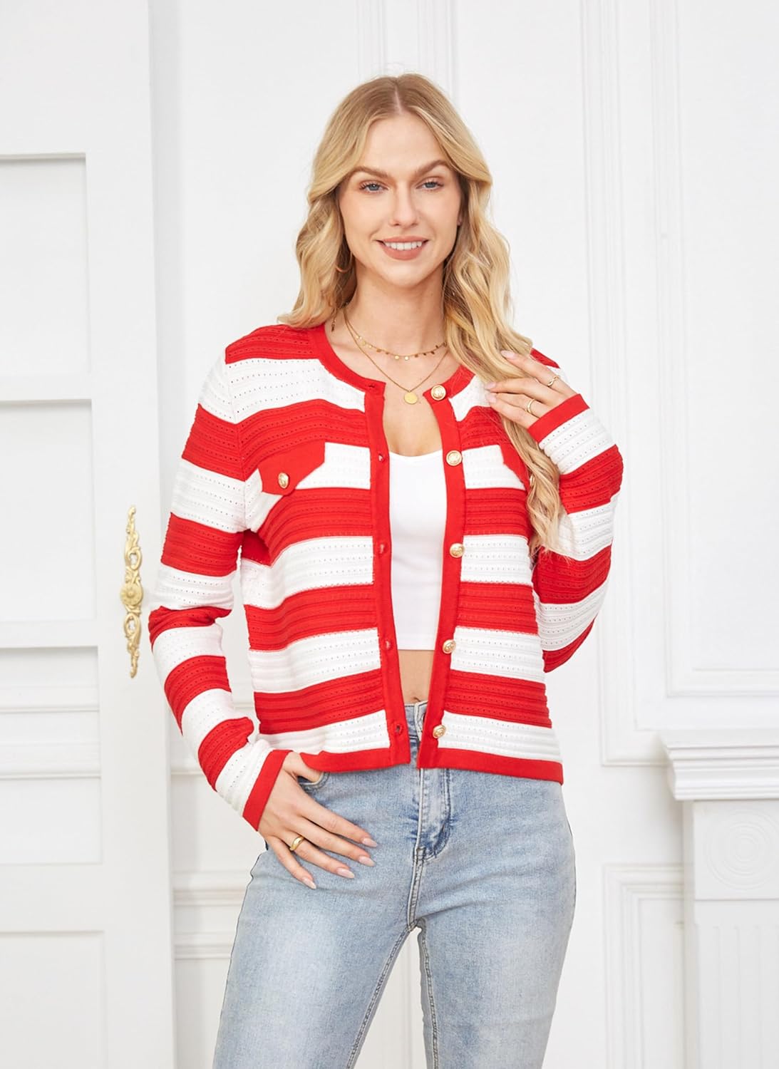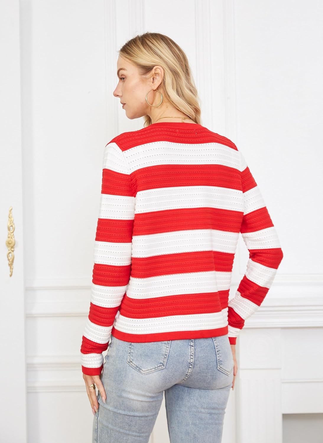 GRACE KARIN Women's Striped Cardigans 2024 Spring Open Front Button Down Knit Sweater Lady Outerwear(Red White Stripe)