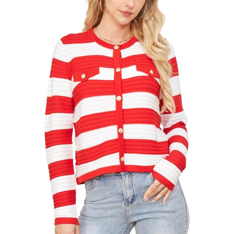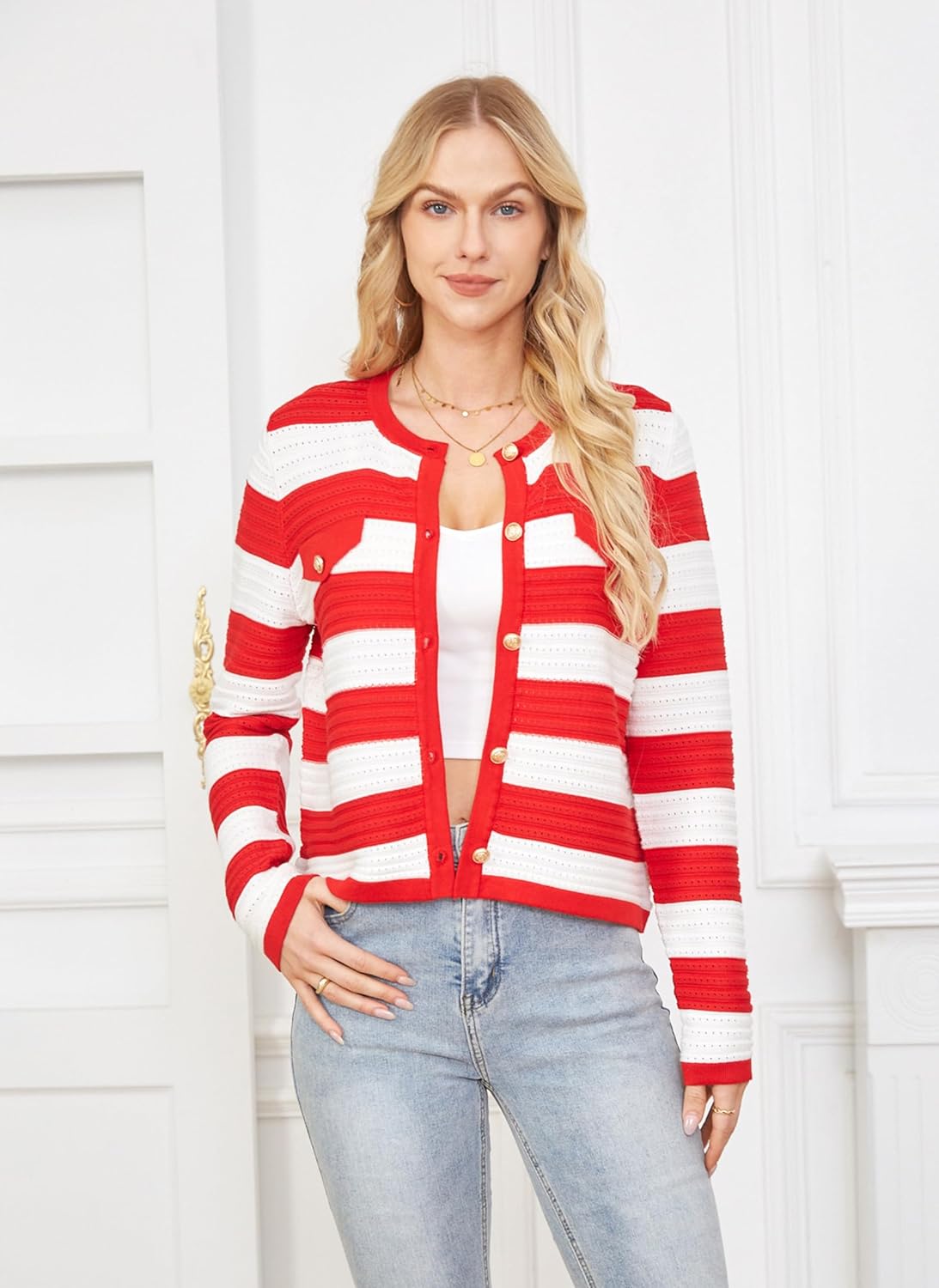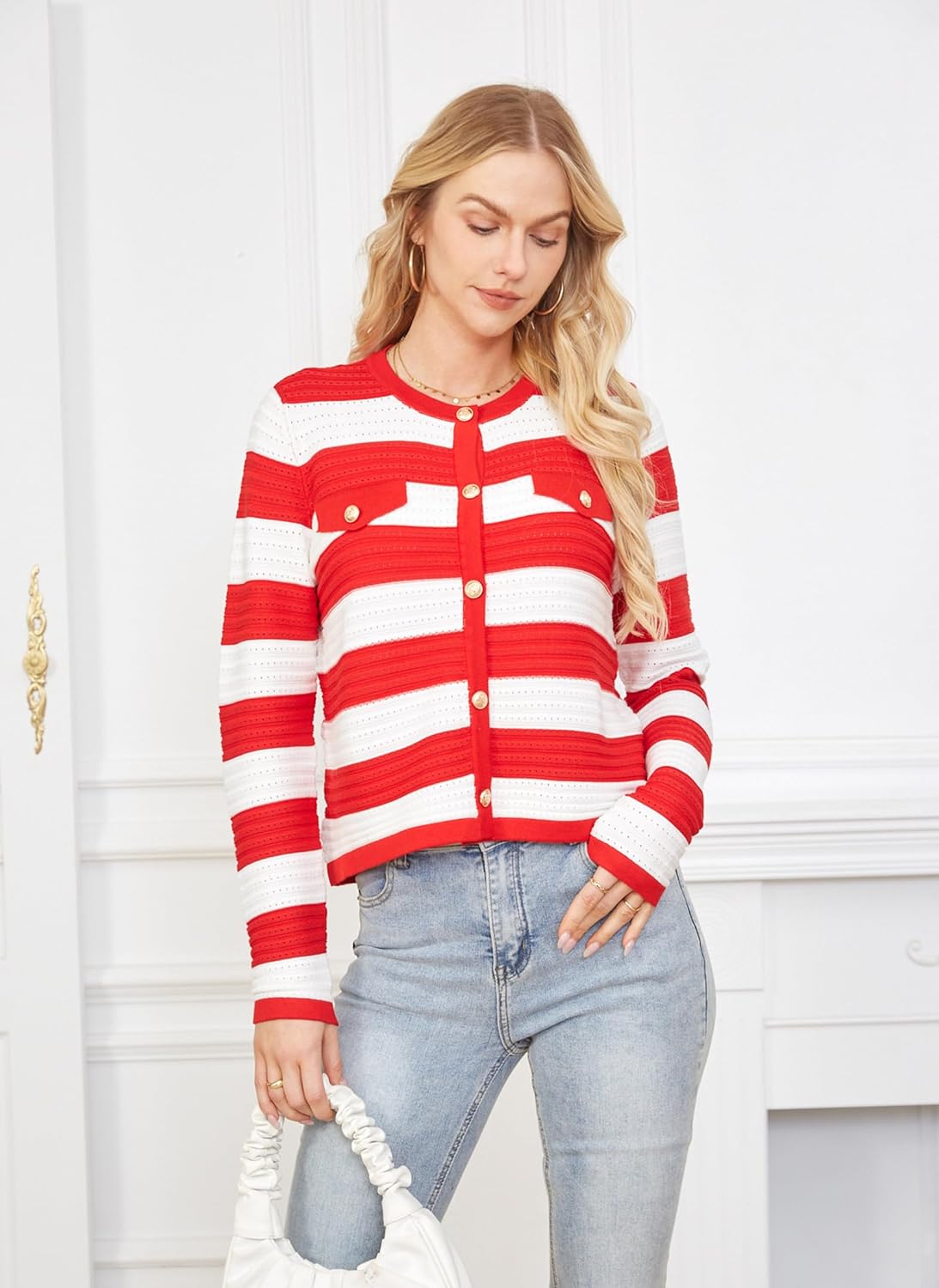 GRACE KARIN Women's Striped Cardigans 2024 Spring Open Front Button Down Knit Sweater Lady Outerwear(Red White Stripe)