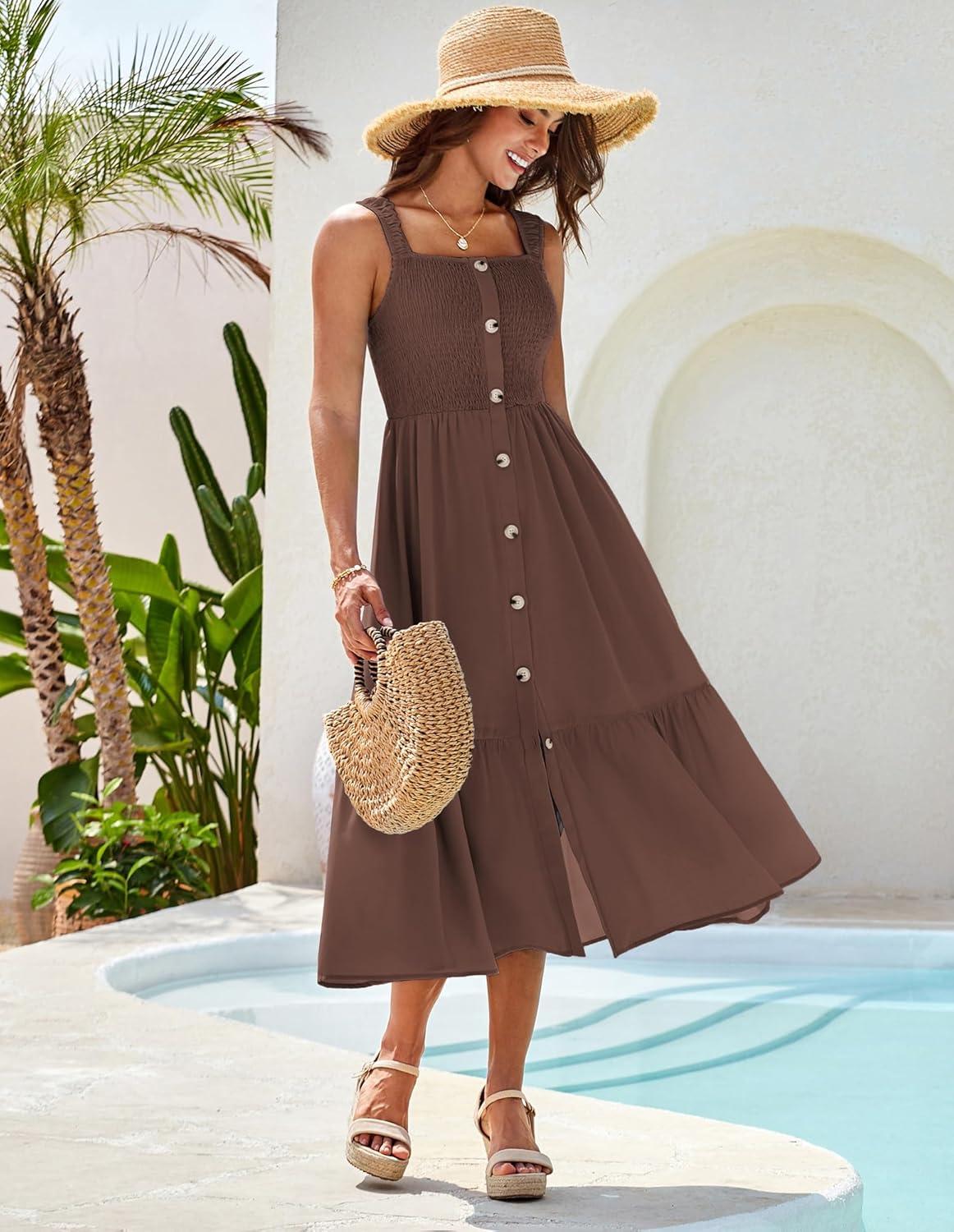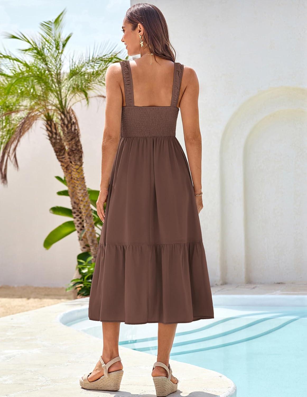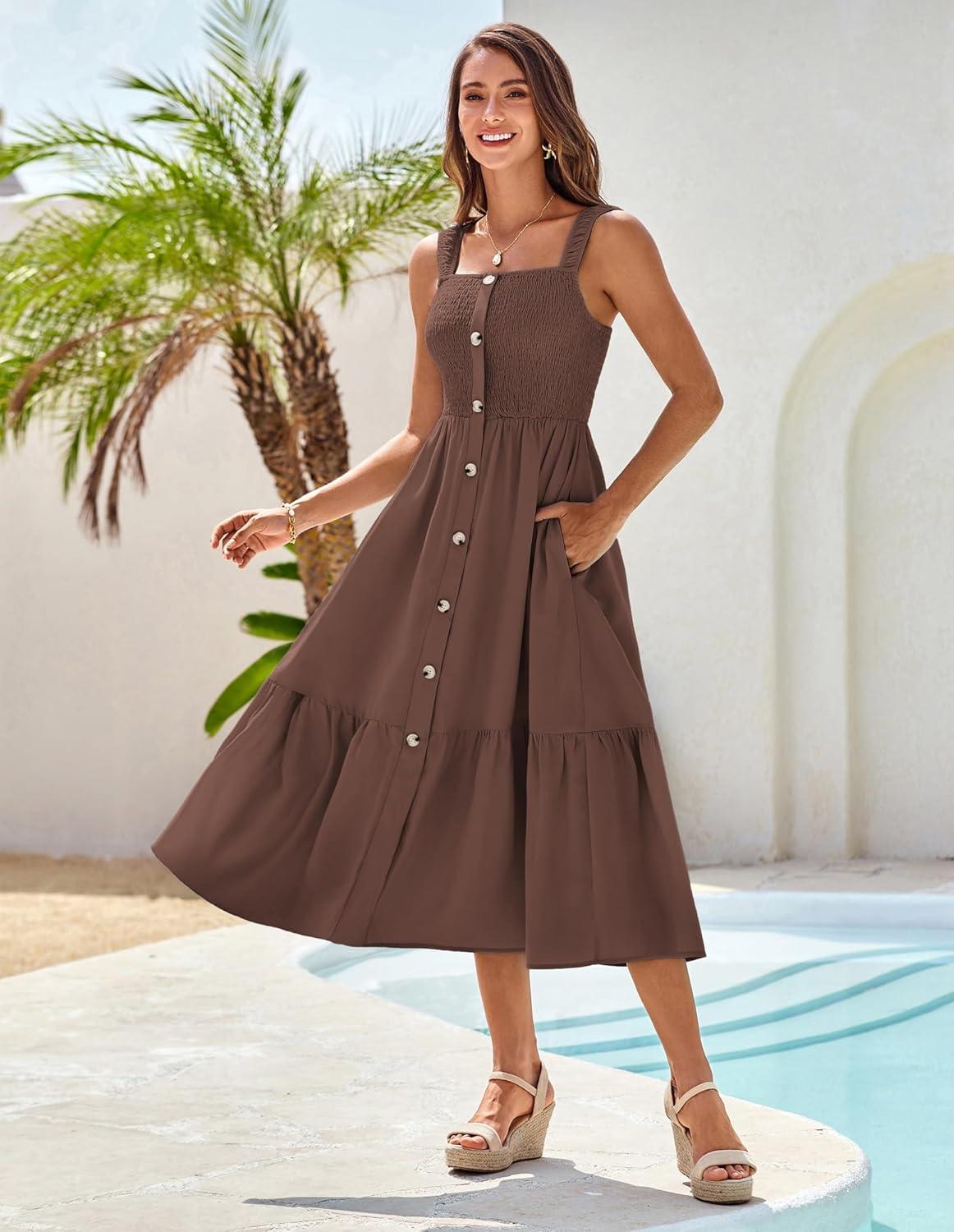 GRACE KARIN Womens Summer 2025 Midi Dress Spaghetti Strap Smocked Button Casual A Line Long Beach Flowy Sun Dresses Pockets(Brown)