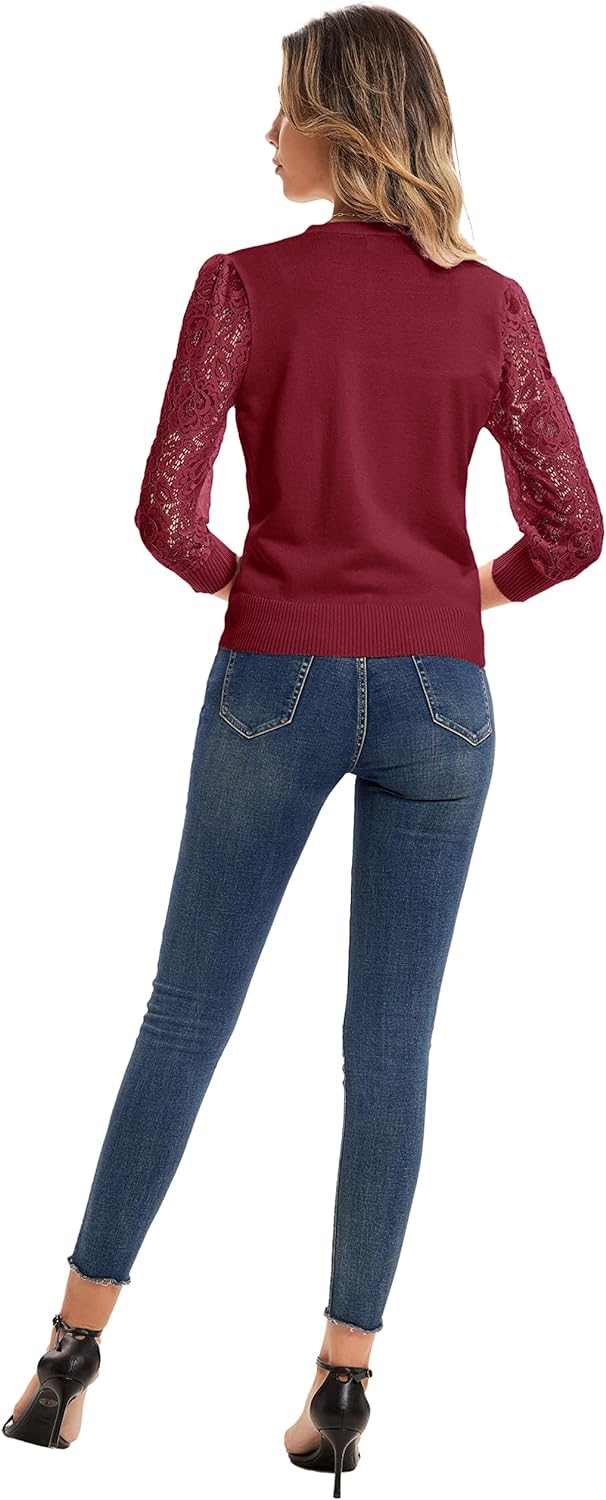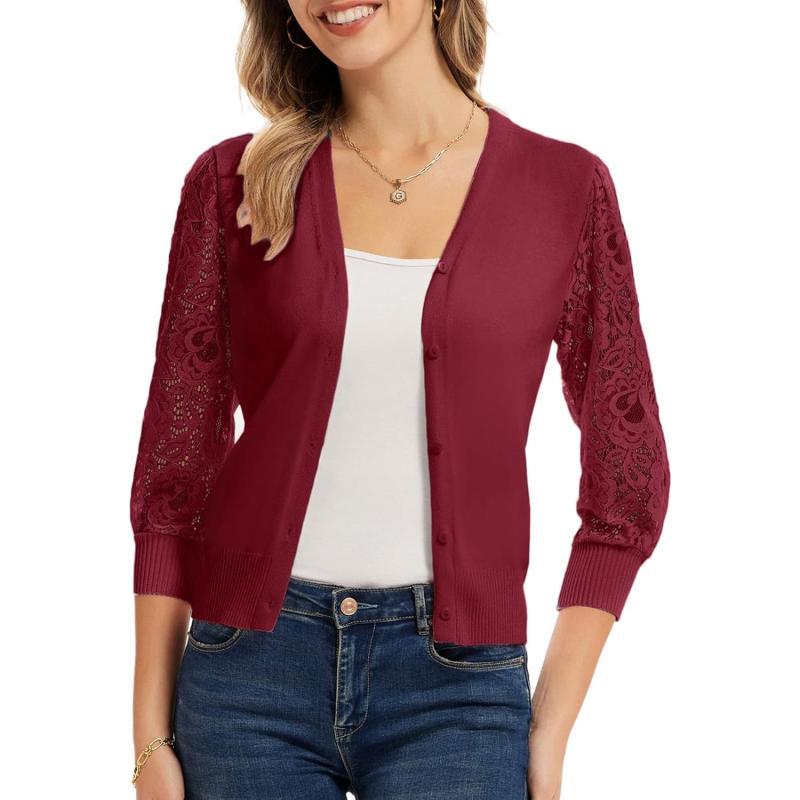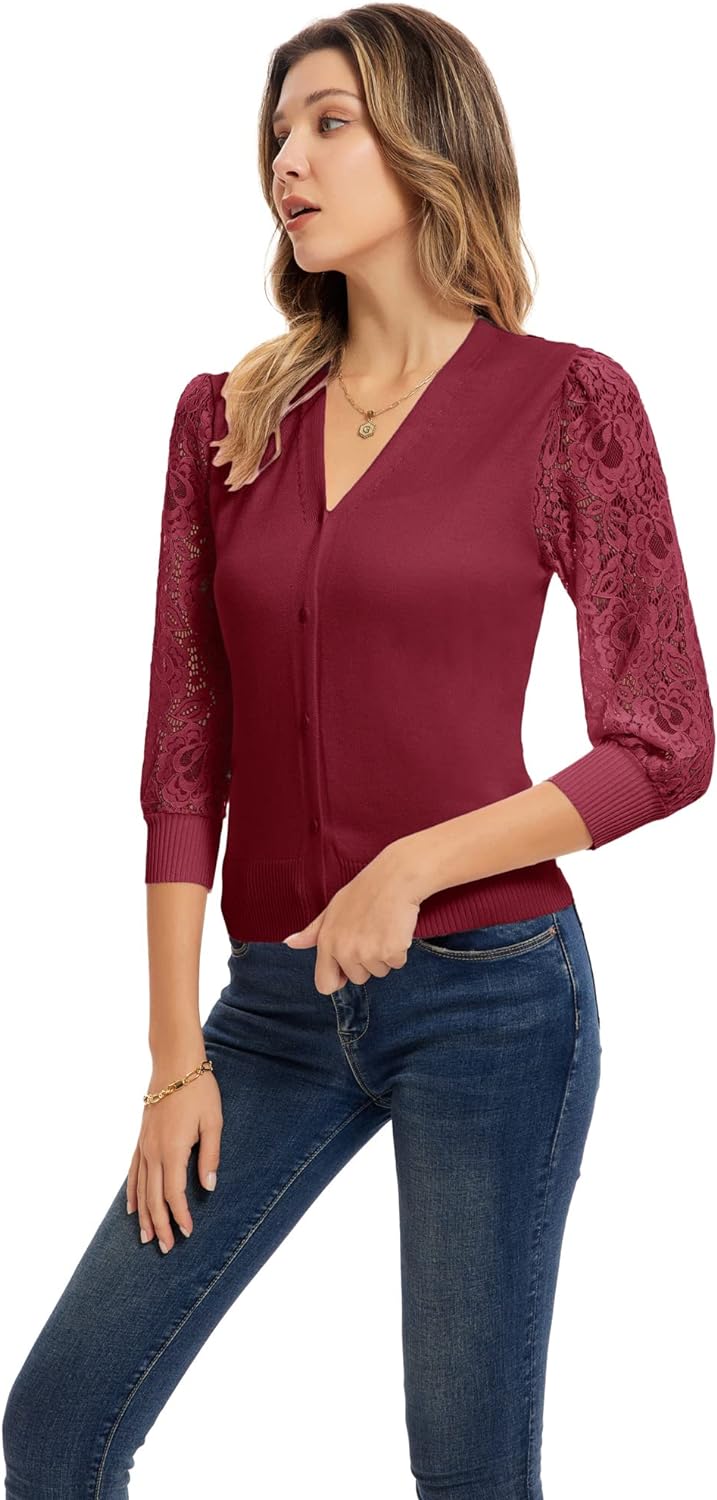 GRACE KARIN Women's Summer Cardigan Lightweight V Neck Lace 3/4 Sleeve Button Front Sweaters(Dark Red)
