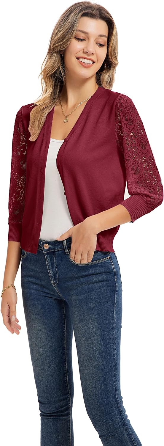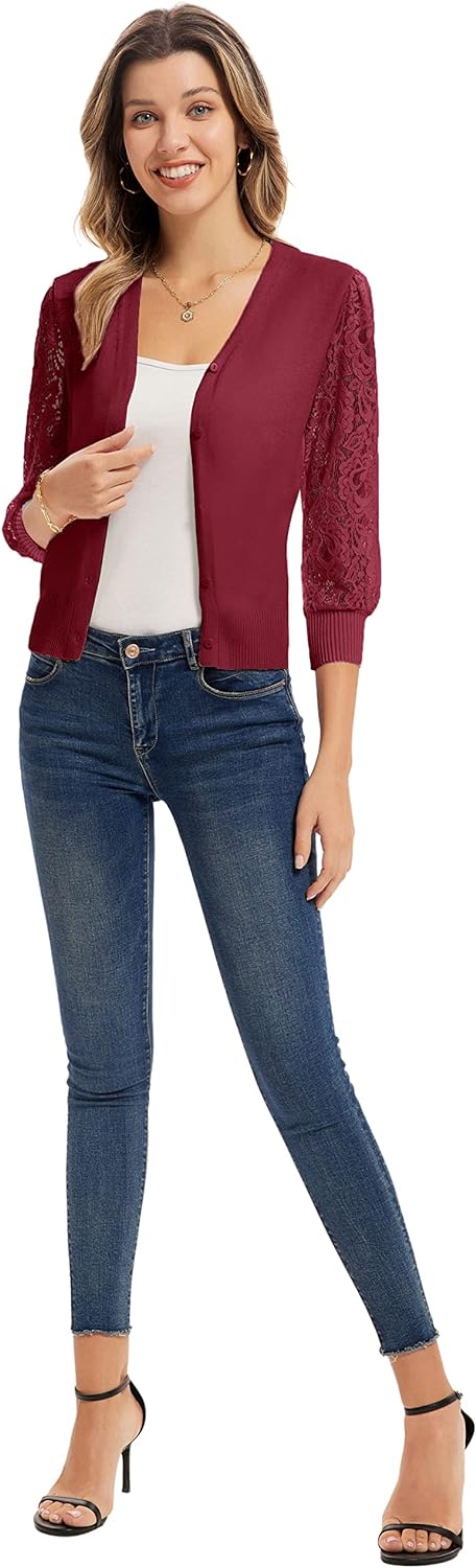 GRACE KARIN Women’s Summer Cardigan Lightweight V Neck Lace 3/4 Sleeve Button Front Sweaters(Dark Red)