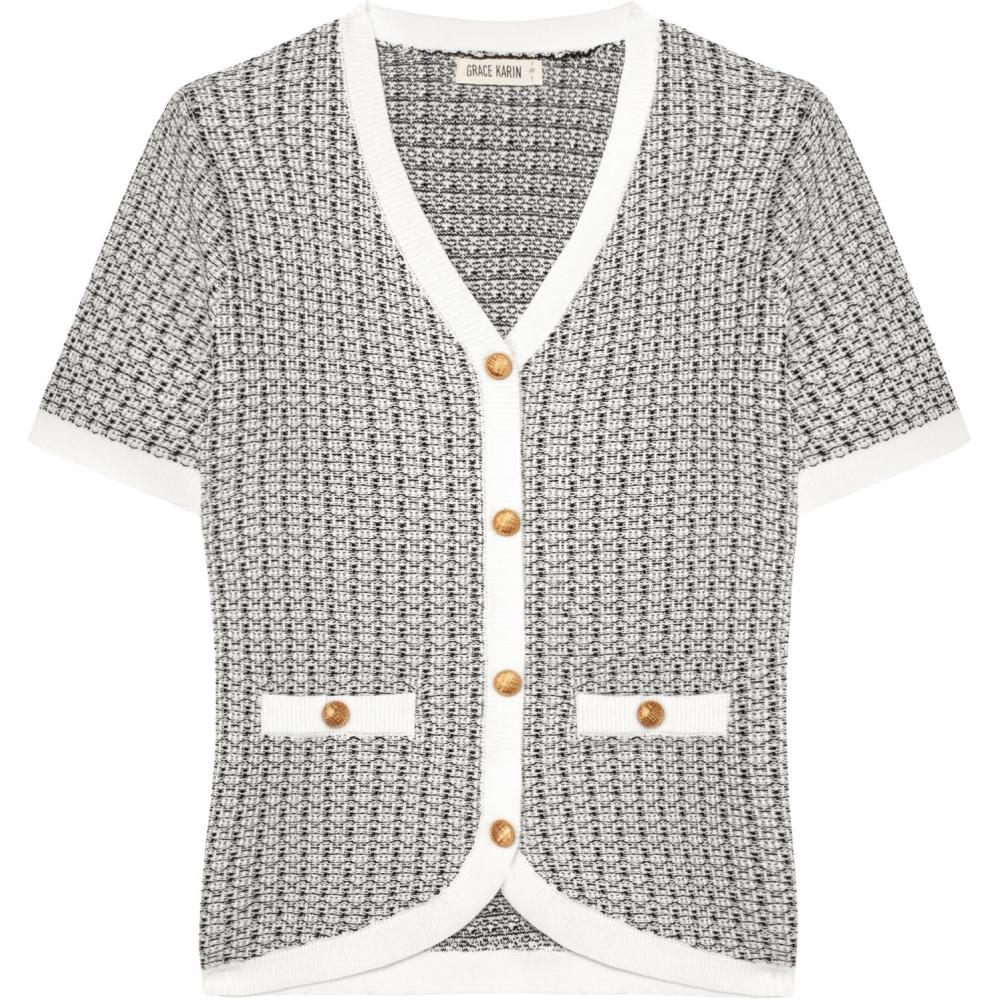 imageGRACE KARIN Womens Summer Cardigan Sweater 2025 Button Down Short Sleeve Cropped Lightweight V Neck Elegant Tweed TopsWhite