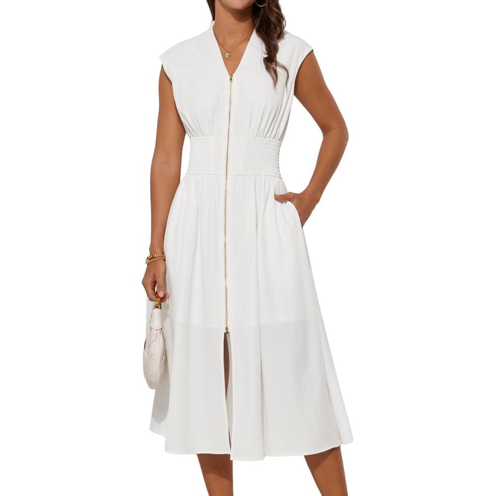 GRACE KARIN Womens Summer Casual Dress, Business Office Work Dresses, Cap Sleeve Zipper Front Flowy Midi Dress with Pockets(Ivory)